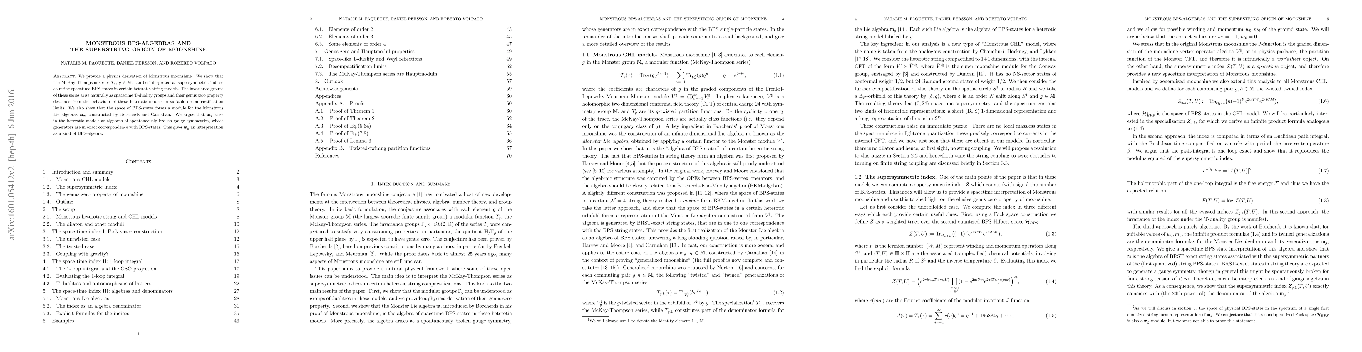 We provide a physics derivation of Monstrous moonshine. We show that the McKay-Thompson series $T_g$, $g\in \mathbb{M}$, can be interpreted as supersymmetric indices counting spacetime BPS-states in certain heterotic string models. The invariance groups of these series arise naturally as spacetime T-duality groups and their genus zero property descends from the behaviour of these heterotic models in suitable decompactification limits. We also show that the space of BPS-states forms a module for the Monstrous Lie algebras $\mathfrak{m}_g$, constructed by Borcherds and Carnahan. We argue that $\mathfrak{m}_g$ arise in the heterotic models as algebras of spontaneously broken gauge symmetries, whose generators are in exact correspondence with BPS-states. This gives $\mathfrak{m}_g$ an interpretation as a kind of BPS-algebra.