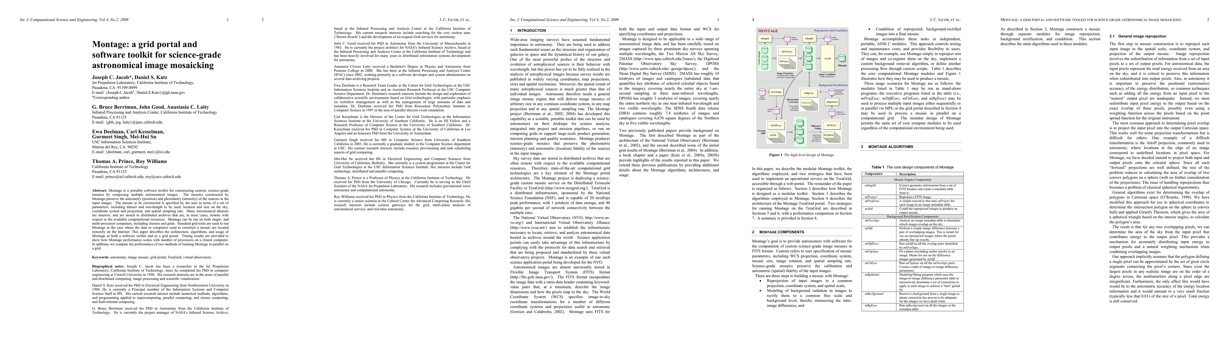 Montage is a versatile software toolkit for creating high-quality astronomical image mosaics, preserving astrometry and photometry. It can run on both local and distributed grid resources, scaling performance with multiple processors.