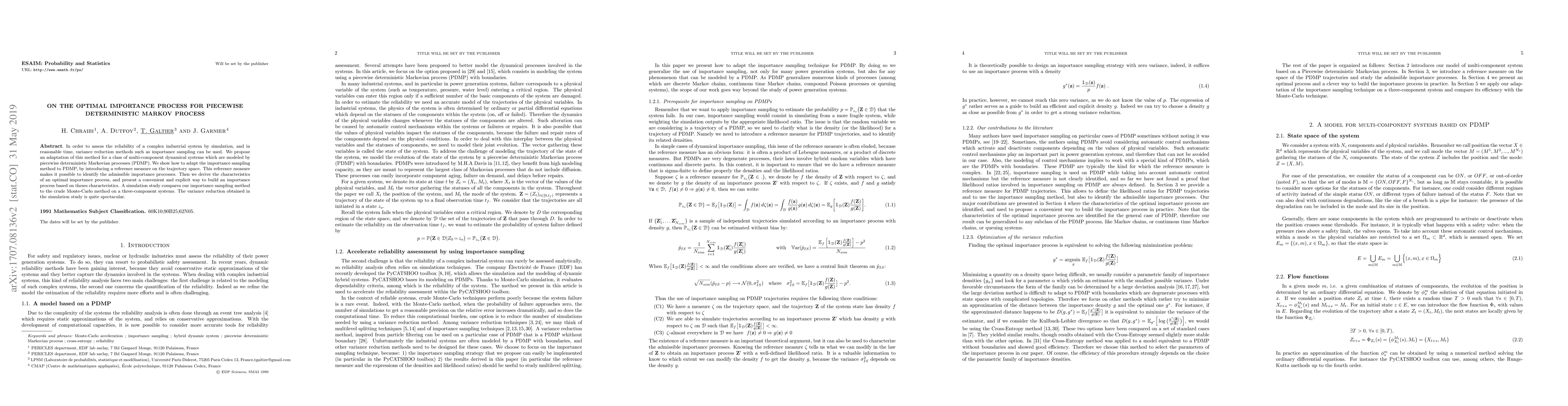This paper proposes an importance sampling method to accelerate Monte-Carlo simulations for assessing the reliability of complex industrial systems modeled by piecewise deterministic Markovian processes (PDMP). The method is demonstrated through a simulation study comparing it to crude Monte-Carlo for a three-component system in hydraulic and nuclear industries.