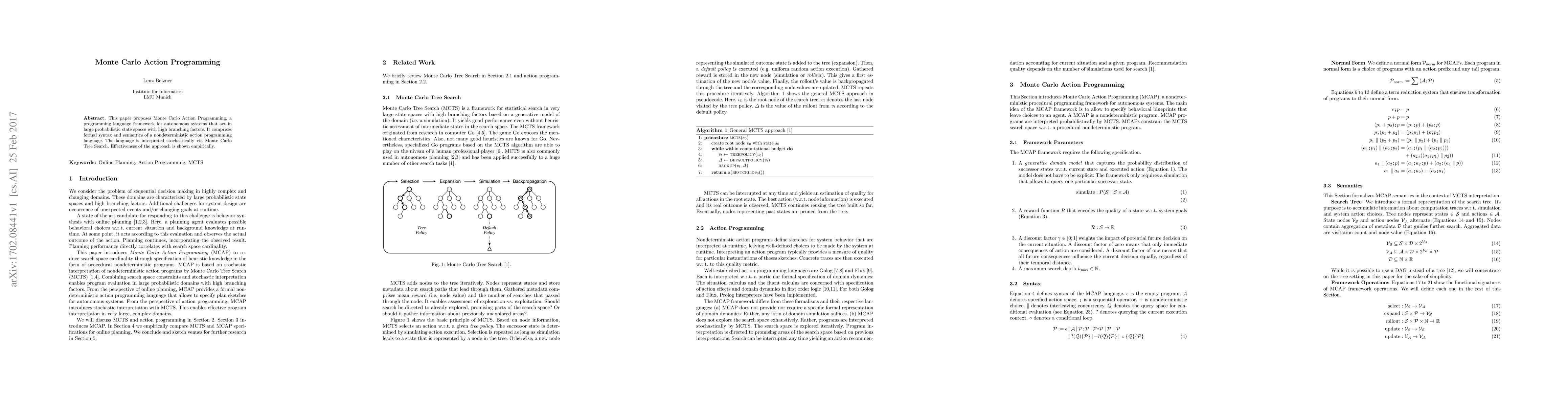 Monte Carlo Action Programming introduces a new framework for autonomous systems navigating large probabilistic state spaces, utilizing stochastic interpretation via Monte Carlo Tree Search to handle high branching factors. Empirical results demonstrate the effectiveness of this novel programming language.