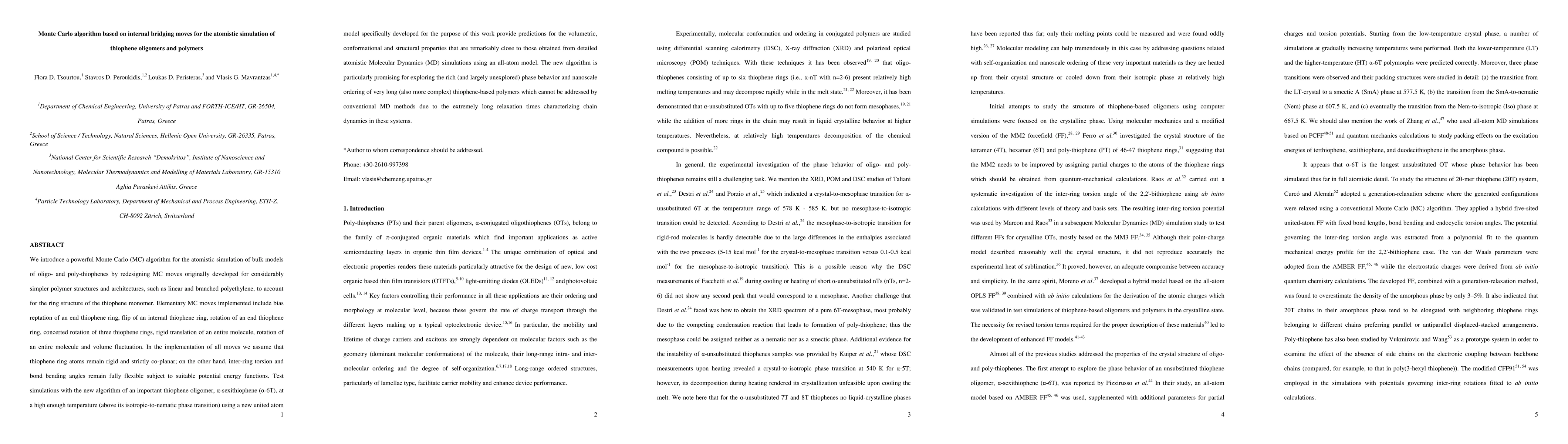 This paper introduces a Monte Carlo algorithm tailored for atomistic simulations of thiophene oligomers and polymers, incorporating internal bridging moves to account for the thiophene ring structure. Test simulations of α-sexithiophene at high temperatures show results comparable to detailed atomistic Molecular Dynamics simulations, indicating the algorithm's potential for exploring the phase behavior and nanoscale ordering of long thiophene-based polymers.