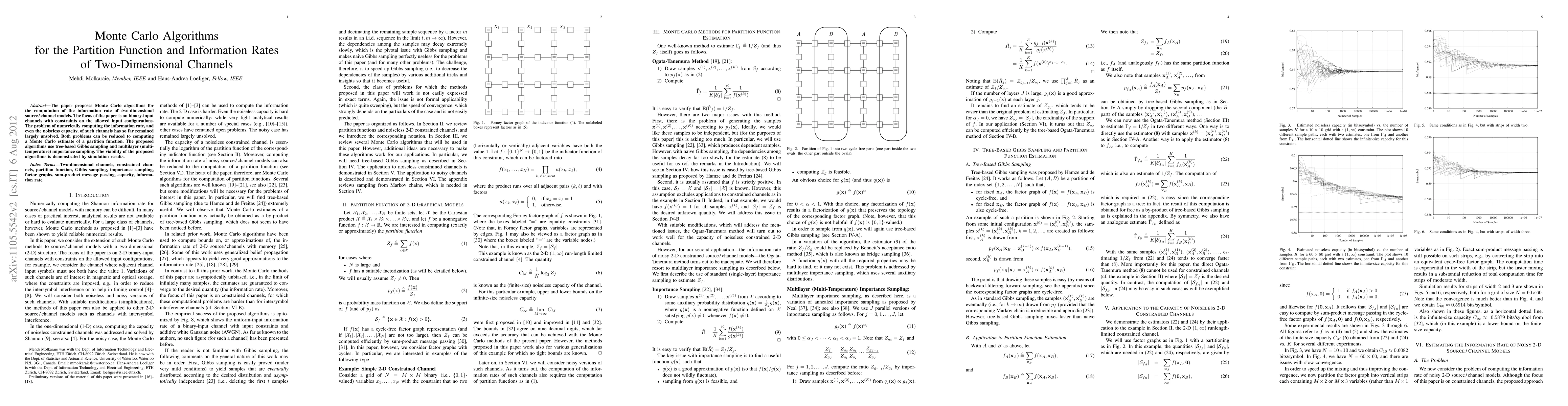 The paper introduces Monte Carlo algorithms for determining the information rate of two-dimensional binary-input channels with input constraints, employing tree-based Gibbs sampling and multilayer importance sampling to compute partition functions. Simulation results validate the effectiveness of the proposed methods.