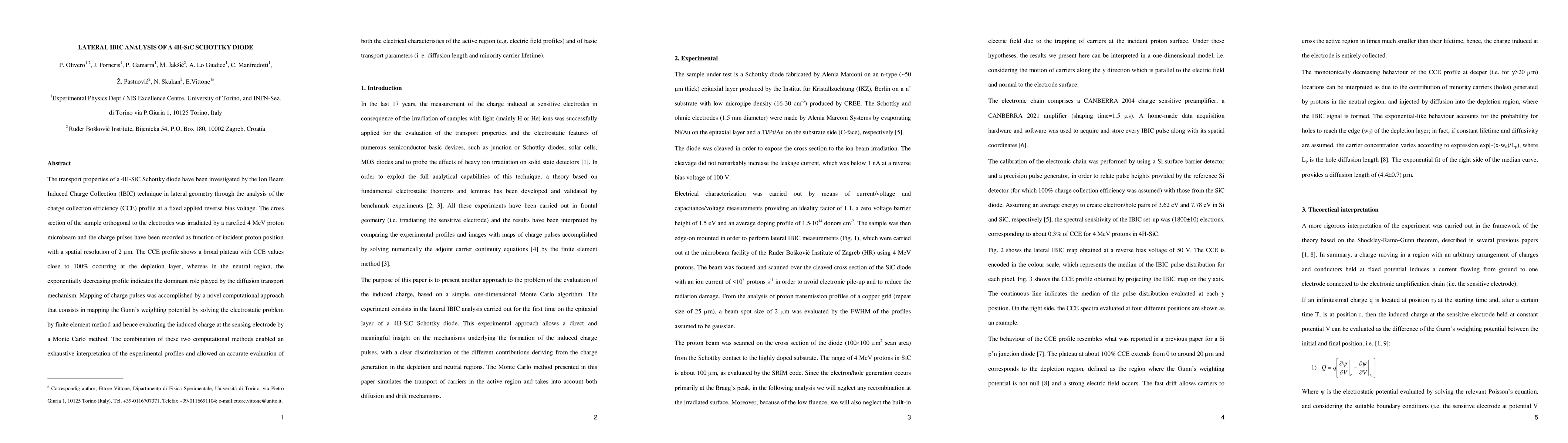 This paper investigates the transport properties of a 4H-SiC Schottky diode using IBIC in lateral geometry, revealing high charge collection efficiency in the depletion layer and dominant diffusion transport in the neutral region. A novel computational approach combining finite element and Monte Carlo methods enabled detailed analysis of the diode's electrical characteristics and transport parameters.