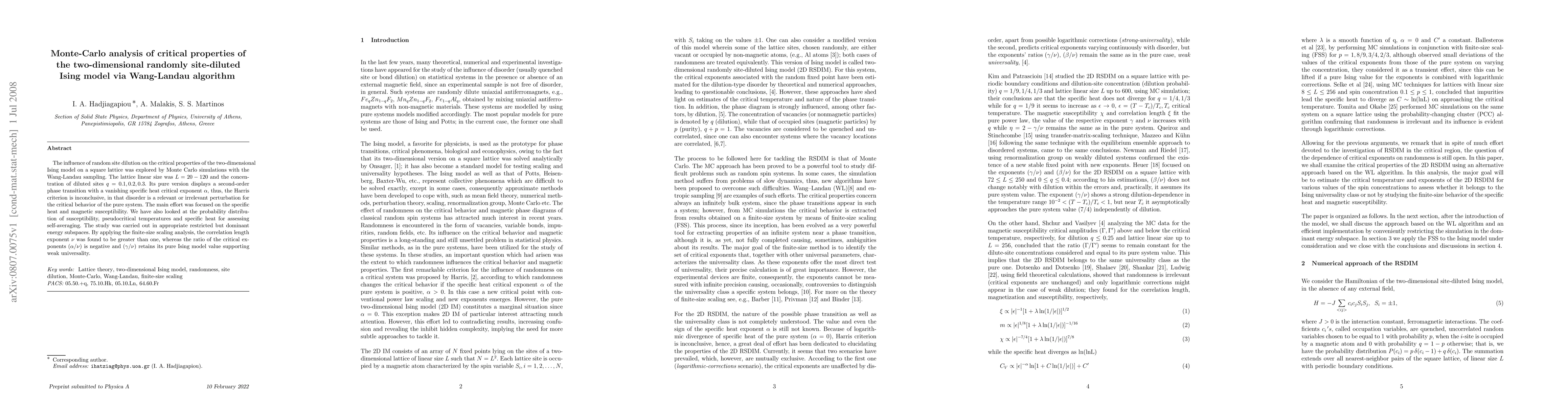 This paper investigates the critical properties of the two-dimensional randomly site-diluted Ising model using Monte Carlo simulations and the Wang-Landau algorithm. The study finds that the correlation length exponent is greater than one, and the ratio of critical exponents indicates weak universality.