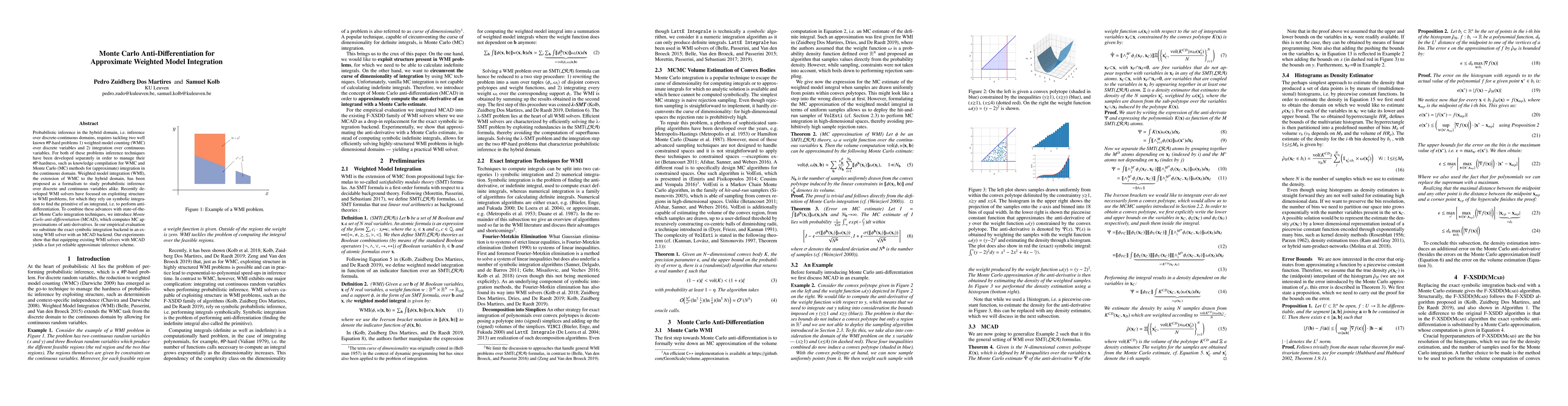Probabilistic inference in the hybrid domain, i.e. inference over discrete-continuous domains, requires tackling two well known #P-hard problems 1)~weighted model counting (WMC) over discrete variables and 2)~integration over continuous variables. For both of these problems inference techniques have been developed separately in order to manage their #P-hardness, such as knowledge compilation for WMC and Monte Carlo (MC) methods for (approximate) integration in the continuous domain. Weighted model integration (WMI), the extension of WMC to the hybrid domain, has been proposed as a formalism to study probabilistic inference over discrete and continuous variables alike. Recently developed WMI solvers have focused on exploiting structure in WMI problems, for which they rely on symbolic integration to find the primitive of an integrand, i.e. to perform anti-differentiation. To combine these advances with state-of-the-art Monte Carlo integration techniques, we introduce \textit{Monte Carlo anti-differentiation} (MCAD), which computes MC approximations of anti-derivatives. In our empirical evaluation we substitute the exact symbolic integration backend in an existing WMI solver with an MCAD backend. Our experiments show that that equipping existing WMI solvers with MCAD yields a fast yet reliable approximate inference scheme.