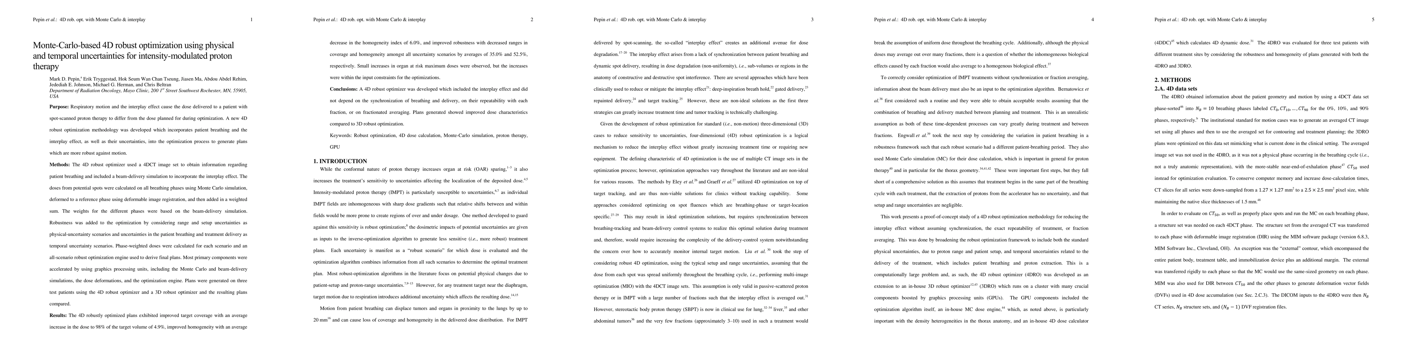 Purpose: Respiratory motion and the interplay effect cause the dose delivered to a patient with spot-scanned proton therapy to differ from the dose planned for during optimization. A new 4D robust optimization methodology was developed which incorporates patient breathing and the interplay effect, as well as their uncertainties, into the optimization process... Methods: The 4D robust optimizer used a 4DCT image set to obtain information regarding patient breathing and included a beam-delivery simulation to incorporate the interplay effect. The doses from potential spots were calculated on all breathing phases using Monte Carlo simulation, deformed to a reference phase using deformable image registration, and then added in a weighted sum. The weights for the different phases were based on the beam-delivery simulation. Robustness was added to the optimization by considering range and setup uncertainties as physical-uncertainty scenarios and uncertainties in the patient breathing and treatment delivery as temporal uncertainty scenarios... Results: The 4D robustly optimized plans exhibited improved target coverage with an average increase in the dose to 98% of the target volume of 4.9%, improved homogeneity with an average decrease in the homogeneity index of 6.0%, and improved robustness with decreased ranges in coverage and homogeneity amongst all uncertainty scenarios by averages of 35.0% and 52.5%, respectively... Conclusions: A 4D robust optimizer was developed which included the interplay effect and did not depend on the synchronization of breathing and delivery...
