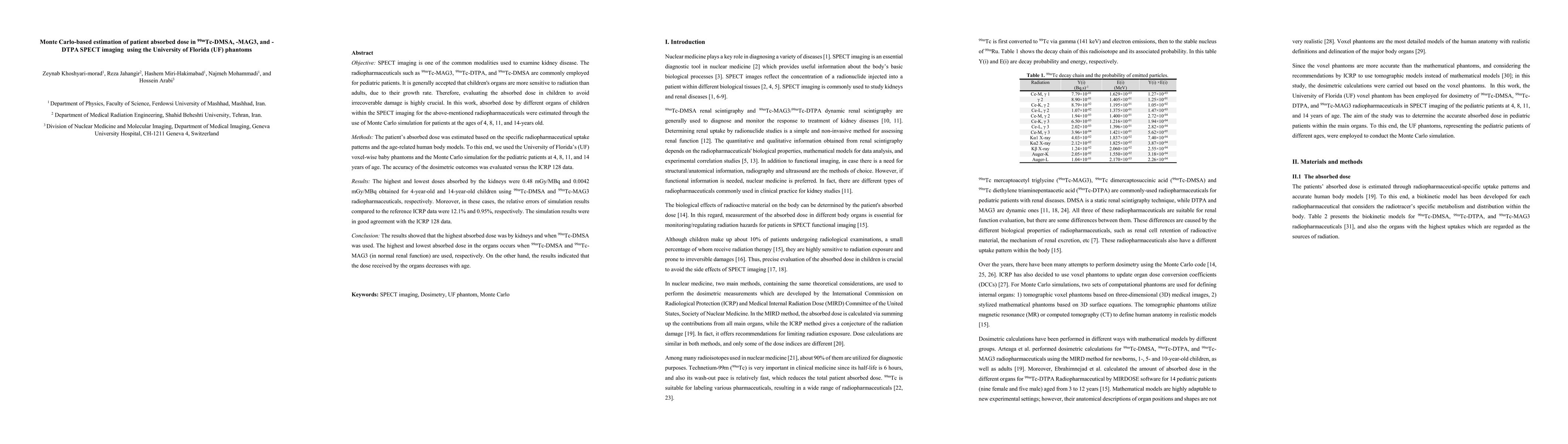 This study employs Monte Carlo simulations to estimate the absorbed dose in pediatric patients undergoing SPECT imaging with 99mTc-DMSA, 99mTc-MAG3, and 99mTc-DTPA, using UF phantoms. Results show that the highest absorbed dose is in the kidneys, particularly with 99mTc-DMSA, and decreases with age.