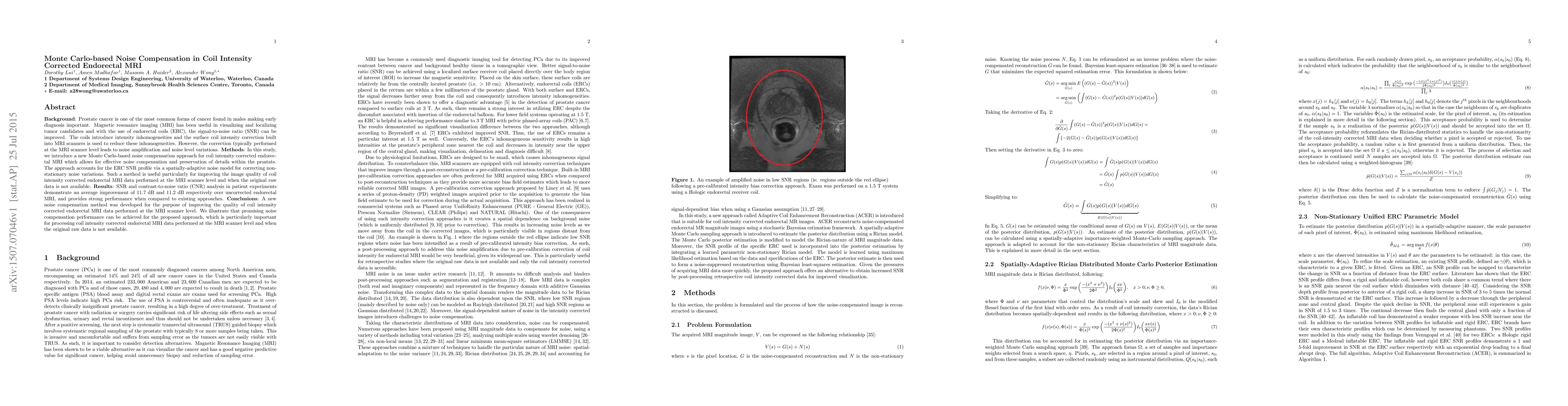 Background: Prostate cancer is one of the most common forms of cancer found in males making early diagnosis important. Magnetic resonance imaging (MRI) has been useful in visualizing and localizing tumor candidates and with the use of endorectal coils (ERC), the signal-to-noise ratio (SNR) can be improved. The coils introduce intensity inhomogeneities and the surface coil intensity correction built into MRI scanners is used to reduce these inhomogeneities. However, the correction typically performed at the MRI scanner level leads to noise amplification and noise level variations. Methods: In this study, we introduce a new Monte Carlo-based noise compensation approach for coil intensity corrected endorectal MRI which allows for effective noise compensation and preservation of details within the prostate. The approach accounts for the ERC SNR profile via a spatially-adaptive noise model for correcting non-stationary noise variations. Such a method is useful particularly for improving the image quality of coil intensity corrected endorectal MRI data performed at the MRI scanner level and when the original raw data is not available. Results: SNR and contrast-to-noise ratio (CNR) analysis in patient experiments demonstrate an average improvement of 11.7 dB and 11.2 dB respectively over uncorrected endorectal MRI, and provides strong performance when compared to existing approaches. Conclusions: A new noise compensation method was developed for the purpose of improving the quality of coil intensity corrected endorectal MRI data performed at the MRI scanner level. We illustrate that promising noise compensation performance can be achieved for the proposed approach, which is particularly important for processing coil intensity corrected endorectal MRI data performed at the MRI scanner level and when the original raw data is not available.