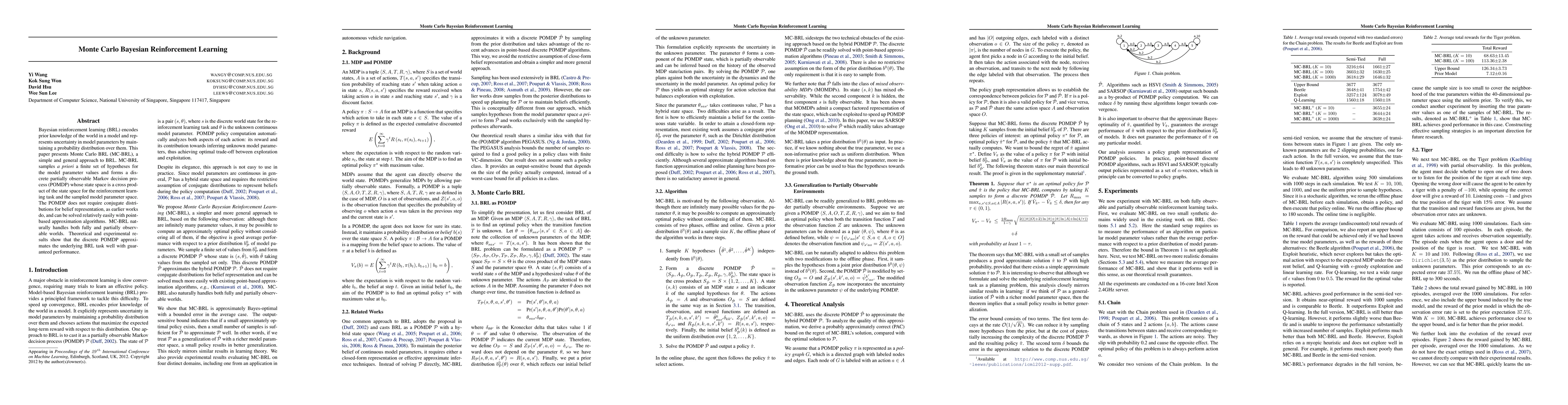 Monte Carlo Bayesian Reinforcement Learning (MC-BRL) samples a finite set of model parameters to form a discrete POMDP, simplifying belief representation and enabling effective point-based approximation algorithms. This approach effectively handles both fully and partially observable environments, demonstrating strong performance approximations in theoretical and experimental evaluations.