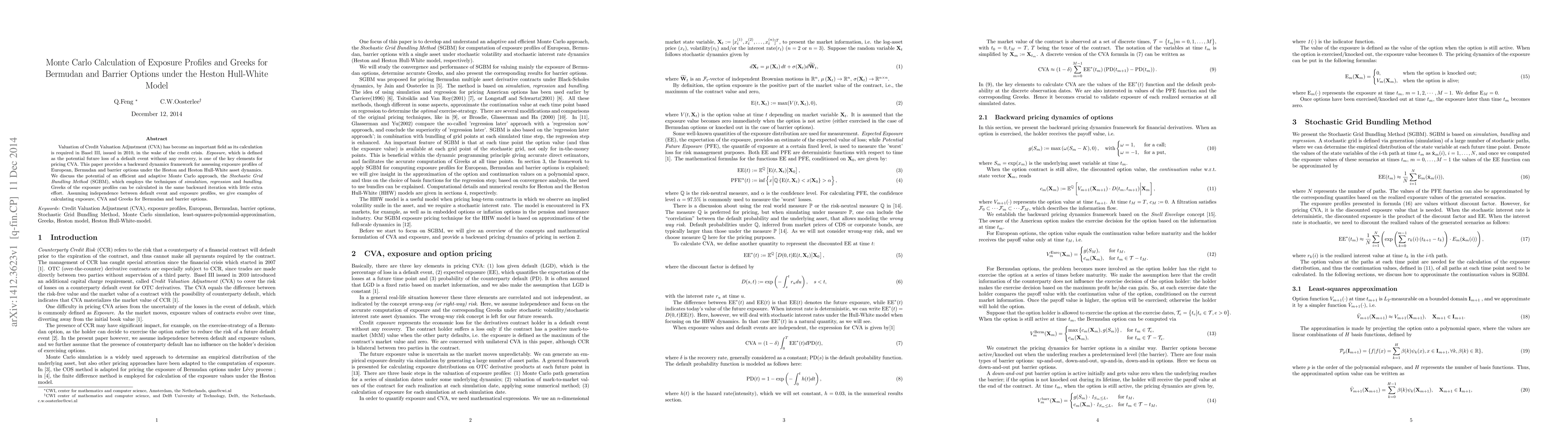 This paper develops a Monte Carlo method, Stochastic Grid Bundling Method (SGBM), for calculating exposure profiles and Greeks for Bermudan and barrier options under the Heston Hull-White model, providing an efficient framework for pricing Credit Valuation Adjustment (CVA) as required by Basel III. The method integrates simulation, regression, and bundling techniques to accurately assess exposure and calculate Greeks during backward dynamics.