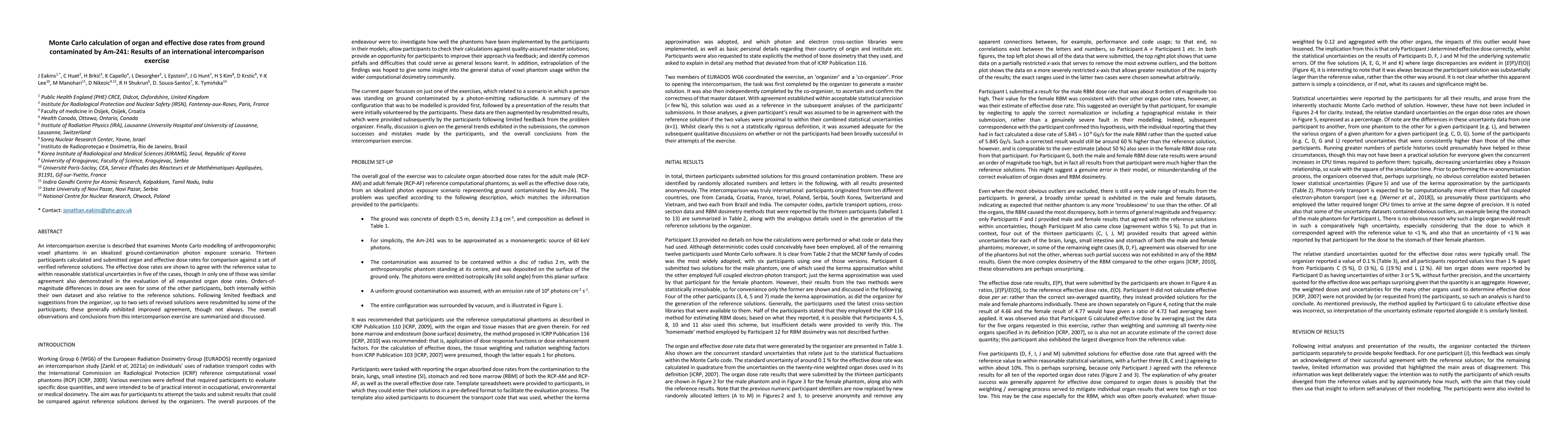 This paper reports on an international intercomparison exercise evaluating Monte Carlo modelling of dose rates from Am-241 contaminated ground, finding that while most participants' effective dose rates agreed with reference values, significant discrepancies existed in organ dose rates, with some participants showing improved results after resubmission following feedback.