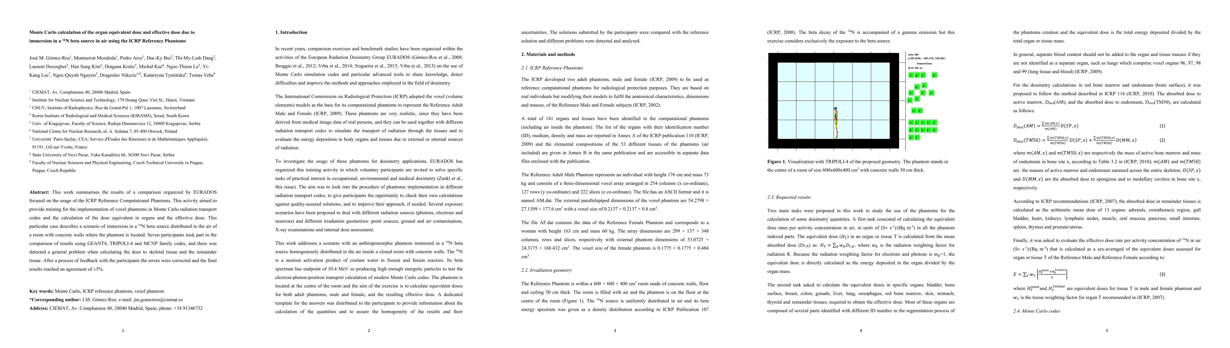 This work summarises the results of a comparison organized by EURADOS focused on the usage of the ICRP Reference Computational Phantoms. This activity aimed to provide training for the implementation of voxel phantoms in Monte Carlo radiation transport codes and the calculation of the dose equivalent in organs and the effective dose. This particular case describes a scenario of immersion in a 16N beta source distributed in the air of a room with concrete walls where the phantom is located. Seven participants took part in the comparison of results using GEANT4, TRIPOLI-4 and MCNP family codes, and there was detected a general problem when calculating the dose to skeletal tissue and the remainder tissue. After a process of feedback with the participants the errors were corrected and the final results reached an agreement of +/-5%.