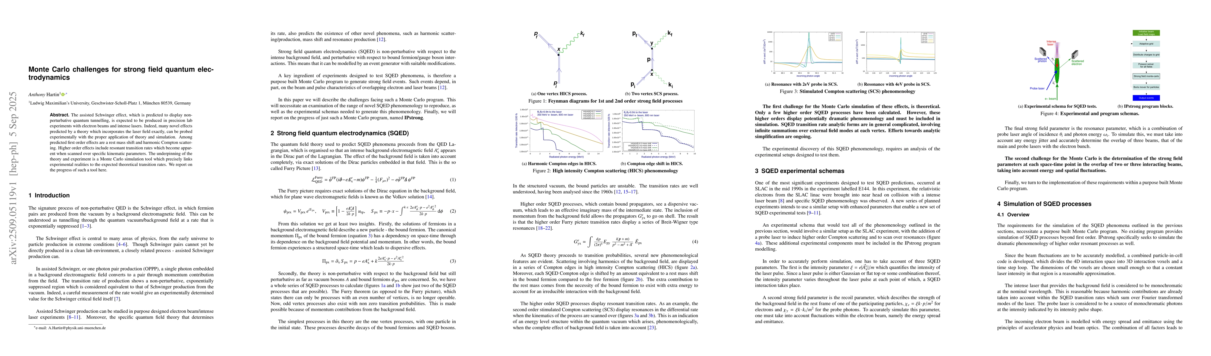 The assisted Schwinger effect, which is predicted to display non-perturbative quantum tunnelling, is expected to be produced in precision lab experiments with electron beams and intense lasers. Indeed, many novel effects predicted by a theory which incorporates the laser field exactly, can be probed experimentally with the proper application of theory and simulation. Among predicted first order effects are a rest mass shift and harmonic Compton scattering. Higher order effects include resonant transition rates which become apparent when scanned over specific kinematic parameters. The underpinning of the theory and experiment is a Monte Carlo simulation tool which precisely links experimental realities to the expected theoretical transition rates. We report on the progress of such a tool here.
