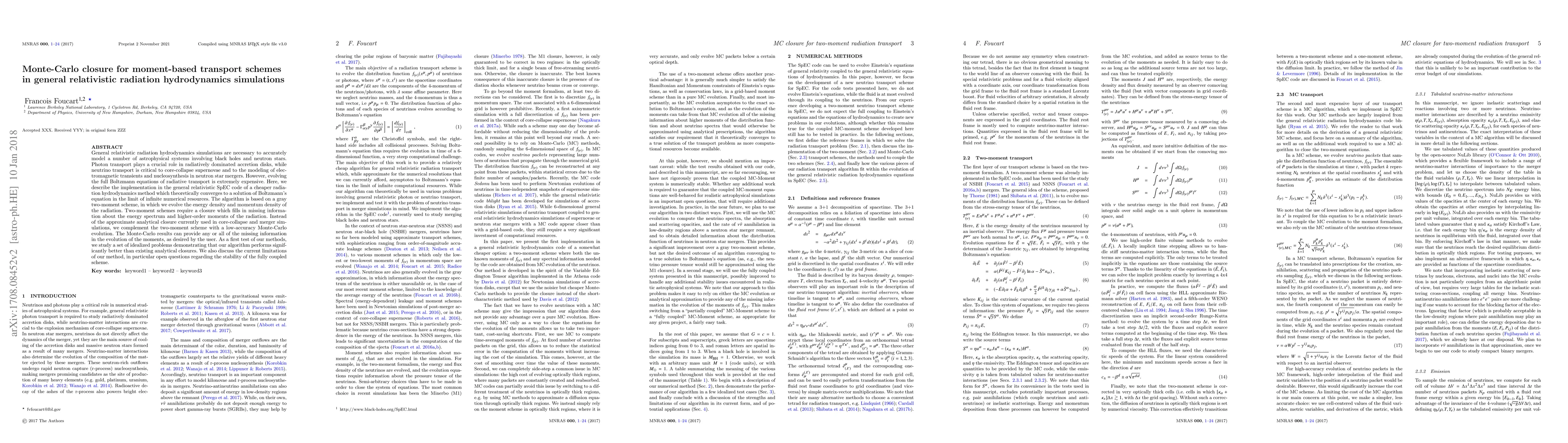 This paper introduces a Monte-Carlo closure for moment-based transport schemes in general relativistic radiation hydrodynamics simulations, aiming to provide a more accurate alternative to existing analytical closures. The proposed method, implemented in the SpEC code, shows significant improvements in idealized tests but raises questions regarding the stability of the fully coupled scheme.