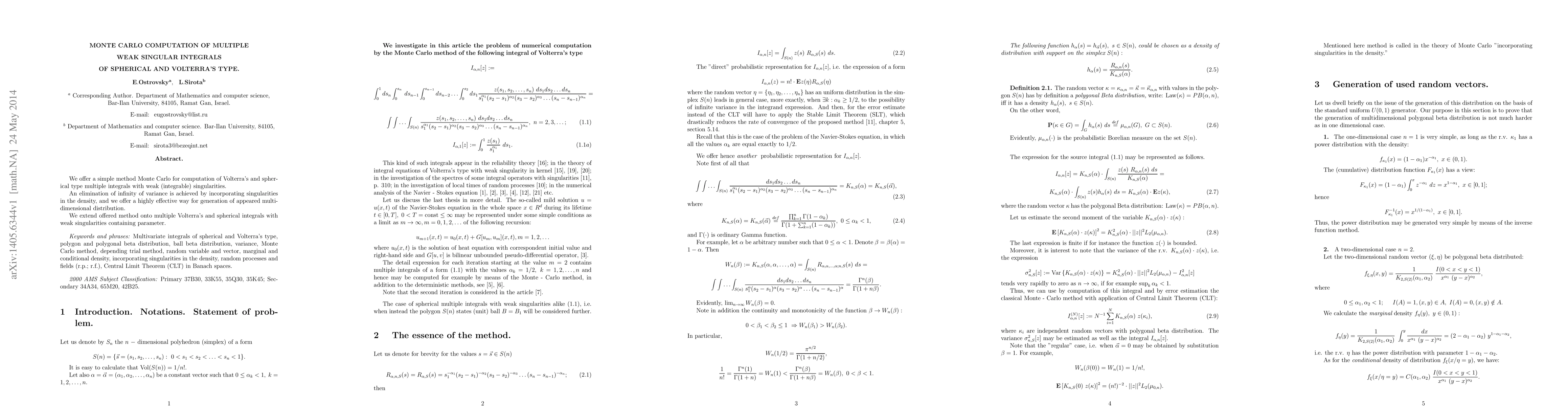 We offer a simple method Monte Carlo for computation of Volterra's and spherical type multiple integrals with weak (integrable) singularities. An elimination of infinity of variance is achieved by incorporating singularities in the density, and we offer a highly effective way for generation of appeared multidimensional distribution. We extend offered method onto multiple Volterra's and spherical integrals with weak singularities containing parameter.