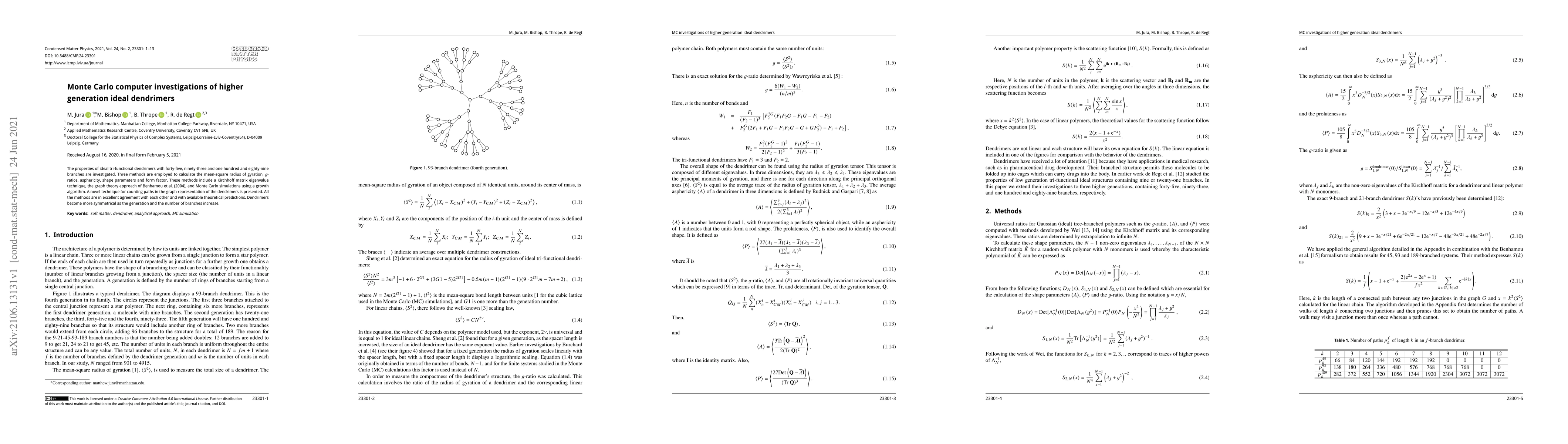 The properties of ideal tri-functional dendrimers with forty-five, ninety-three and one hundred and eighty-nine branches are investigated. Three methods are employed to calculate the mean-square radius of gyration, $g$-ratios, asphericity, shape parameters and form factor. These methods include a Kirchhoff matrix eigenvalue technique, the graph theory approach of Benhamou et al. (2004), and Monte Carlo simulations using a growth algorithm. A novel technique for counting paths in the graph representation of the dendrimers is presented. All the methods are in excellent agreement with each other and with available theoretical predictions. Dendrimers become more symmetrical as the generation and the number of branches increase.