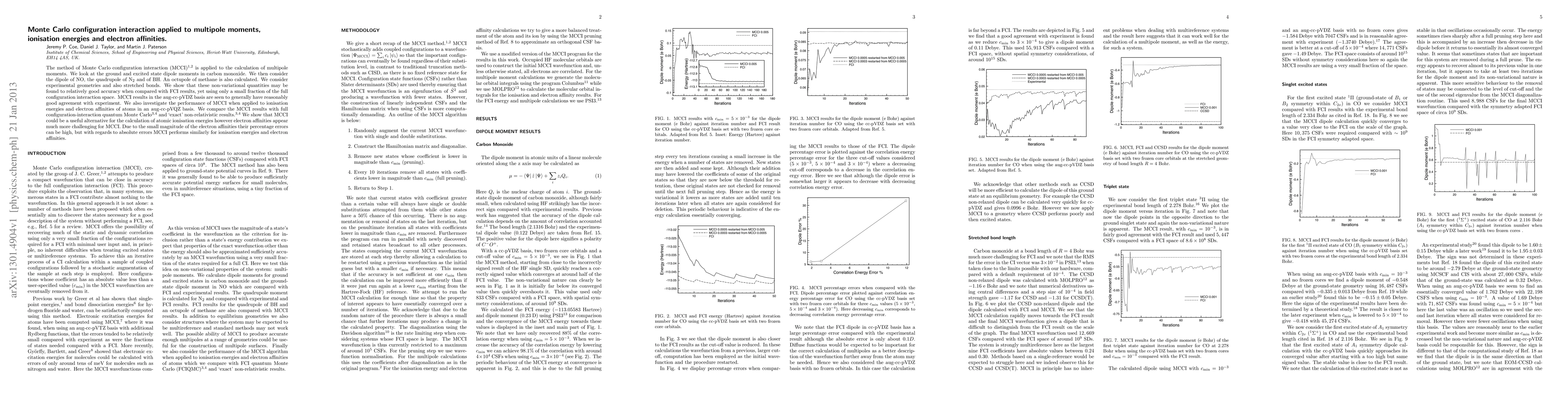 The paper applies Monte Carlo configuration interaction (MCCI) to calculate multipole moments and ionization energies/electron affinities, demonstrating its accuracy compared to full configuration interaction (FCI) and experimental data. MCCI shows promise for ionization energies but faces challenges in calculating electron affinities due to their small magnitudes.