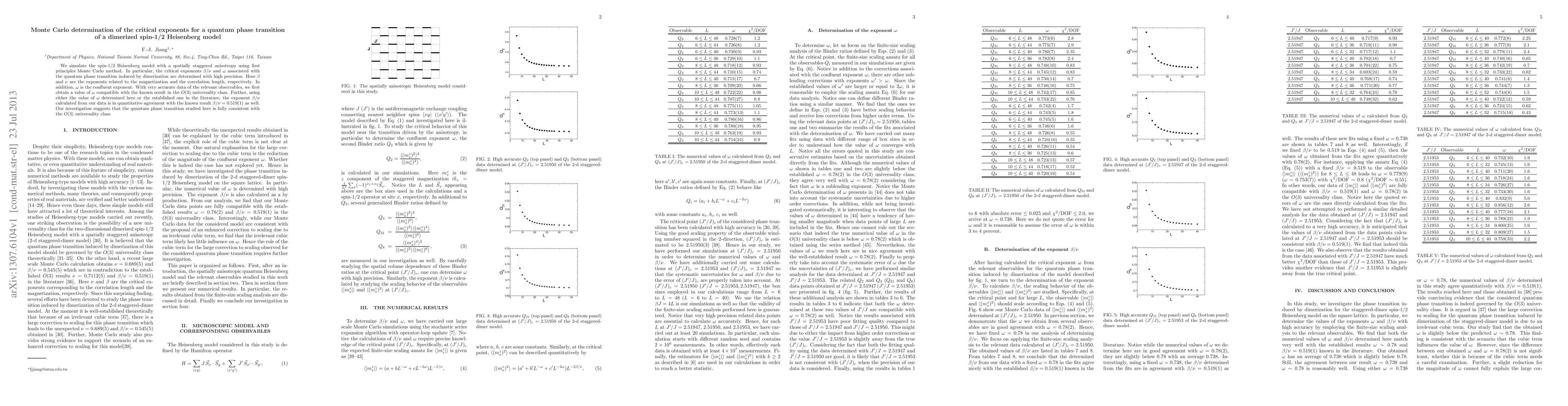 We simulate the spin-1/2 Heisenberg model with a spatially staggered anisotropy using first principles Monte Carlo method. In particular, the critical exponents $\beta/\nu$ and $\omega$ associated with the quantum phase transition induced by dimerization are determined with high precision. Here $\beta$ and $\nu$ are the exponents related to the magnetization and the correlation length, respectively. In addition, $\omega$ is the confluent exponent. With very accurate data of the relevant observables, we first obtain a value of $\omega$ compatible with the known result in the O(3) universality class. Further, using either the value of $\omega$ determined here or the established one in the literature, the exponent $\beta/\nu$ calculated from our data is in quantitative agreement with the known result $\beta/\nu = 0.519(1)$ as well. Our investigation suggests that the quantum phase transition studied here is fully consistent with the O(3) universality class.