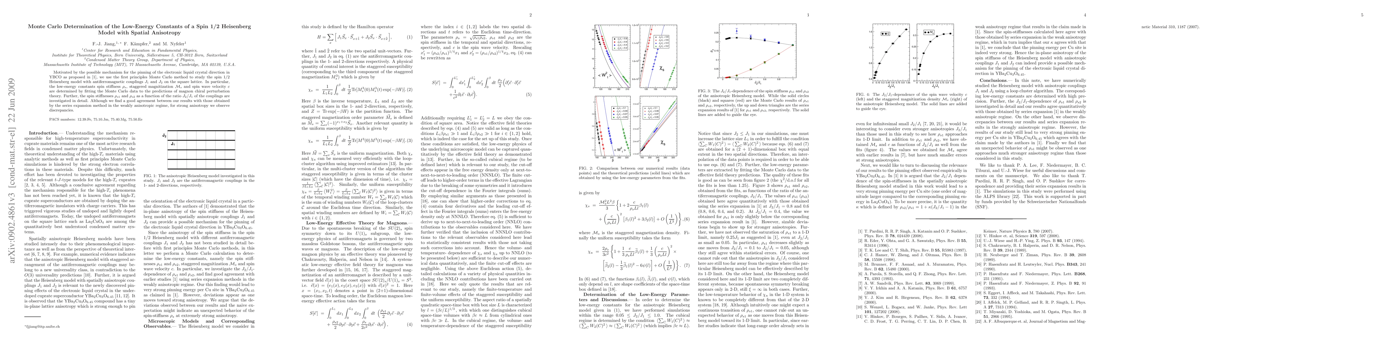 Motivated by the possible mechanism for the pinning of the electronic liquid crystal direction in YBCO as proposed in \cite{Pardini08}, we use the first principles Monte Carlo method to study the spin 1/2 Heisenberg model with antiferromagnetic couplings $J_{1}$ and $J_{2}$ on the square lattice. The corresponding low-energy constants, namely the spin stiffness $\rho_s$, the staggered magnetization density ${\cal M}_s$, the spin wave velocity $c$, as well as the ground state energy density $e_0$ are determined by fitting the Monte Carlo data to the predictions of magnon chiral perturbation theory. In particular, the spin stiffnesses $\rho_{s1}$ and $\rho_{s2}$ are investigated as a function of the ratio $J_{2}/J_{1}$ of the couplings. Although we find a good agreement between our results with those obtained by the series expansion method in the weakly anisotropic regime, for strong anisotropy we observe discrepancies.