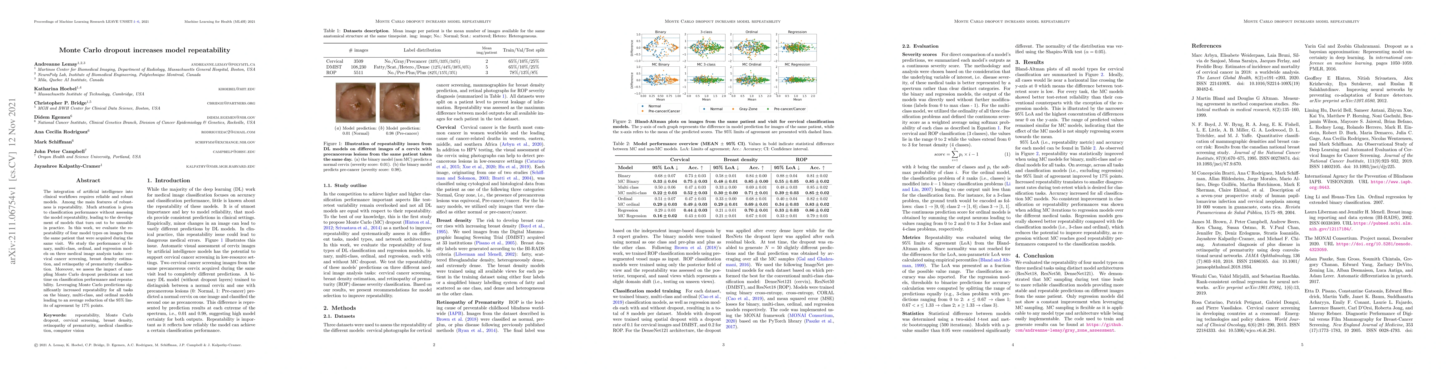 The integration of artificial intelligence into clinical workflows requires reliable and robust models. Among the main features of robustness is repeatability. Much attention is given to classification performance without assessing the model repeatability, leading to the development of models that turn out to be unusable in practice. In this work, we evaluate the repeatability of four model types on images from the same patient that were acquired during the same visit. We study the performance of binary, multi-class, ordinal, and regression models on three medical image analysis tasks: cervical cancer screening, breast density estimation, and retinopathy of prematurity classification. Moreover, we assess the impact of sampling Monte Carlo dropout predictions at test time on classification performance and repeatability. Leveraging Monte Carlo predictions significantly increased repeatability for all tasks on the binary, multi-class, and ordinal models leading to an average reduction of the 95% limits of agreement by 17% points.
