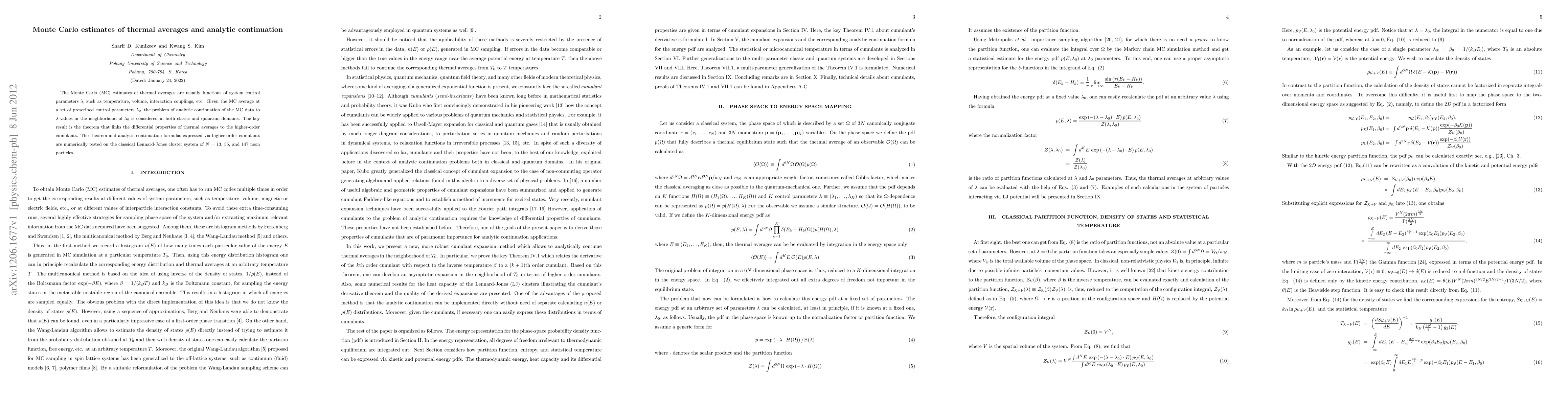 This paper explores the analytic continuation of Monte Carlo estimates of thermal averages to nearby control parameter values, linking these estimates to higher-order cumulants. The proposed theorem and continuation formulas are tested on the Lennard-Jones cluster system for various particle counts.