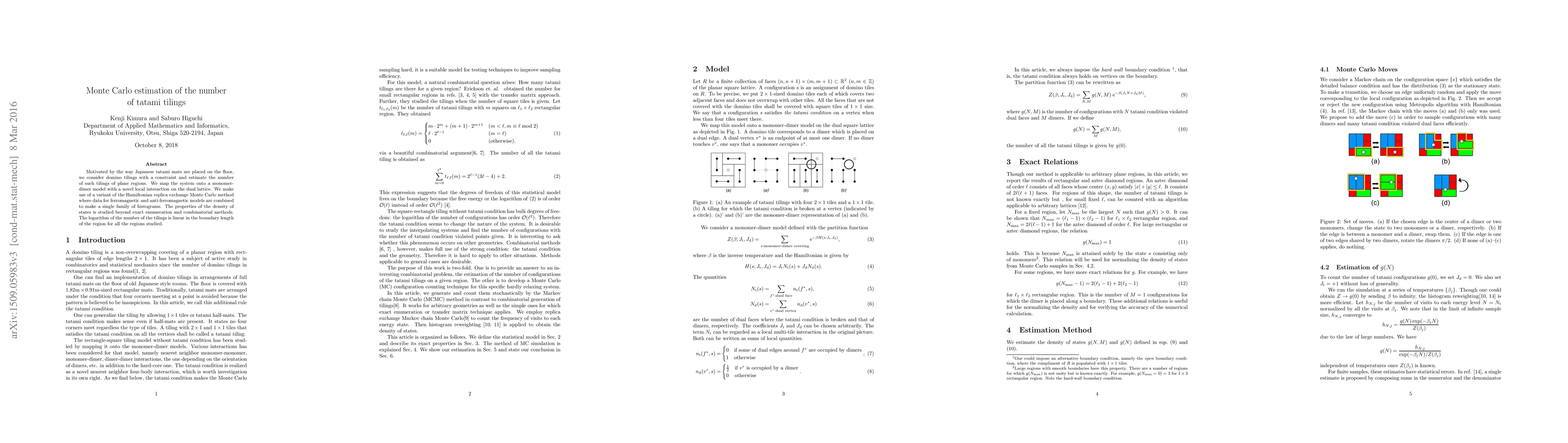 This paper estimates the number of tatami tilings of plane regions using Monte Carlo methods, mapping the problem onto a monomer-dimer model with a unique interaction. The study employs Hamiltonian replica exchange Monte Carlo and multi-parameter reweighting, revealing a linear relationship between the logarithm of tilings and the boundary length of the region.
