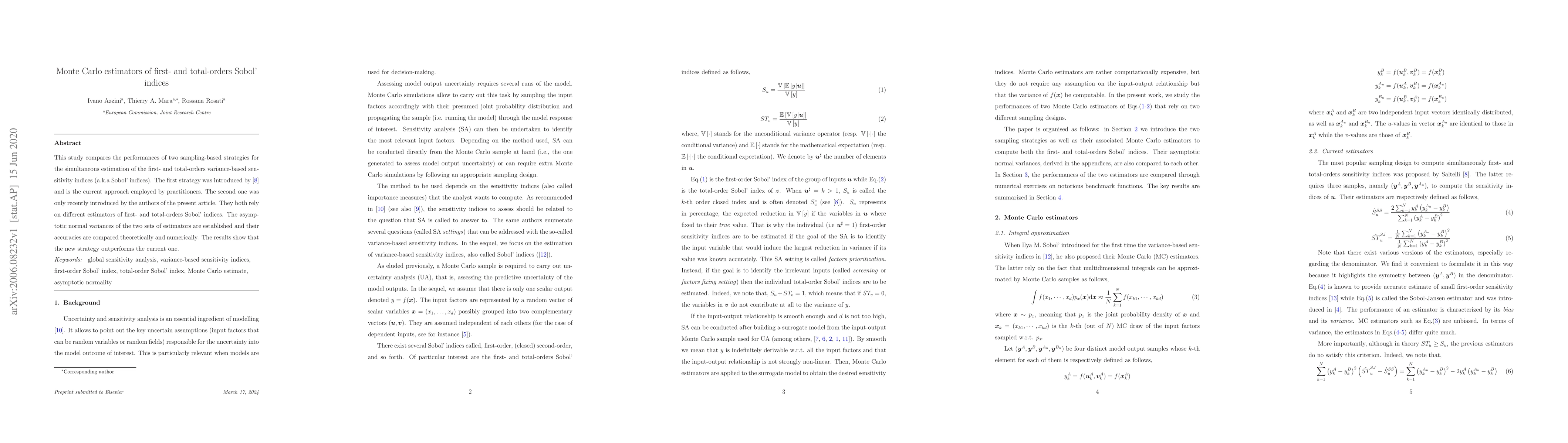 The paper presents novel Monte Carlo estimators for first- and total-order Sobol' indices, along with their asymptotic normal variances, providing a theoretical and numerical comparison between two sampling strategies.