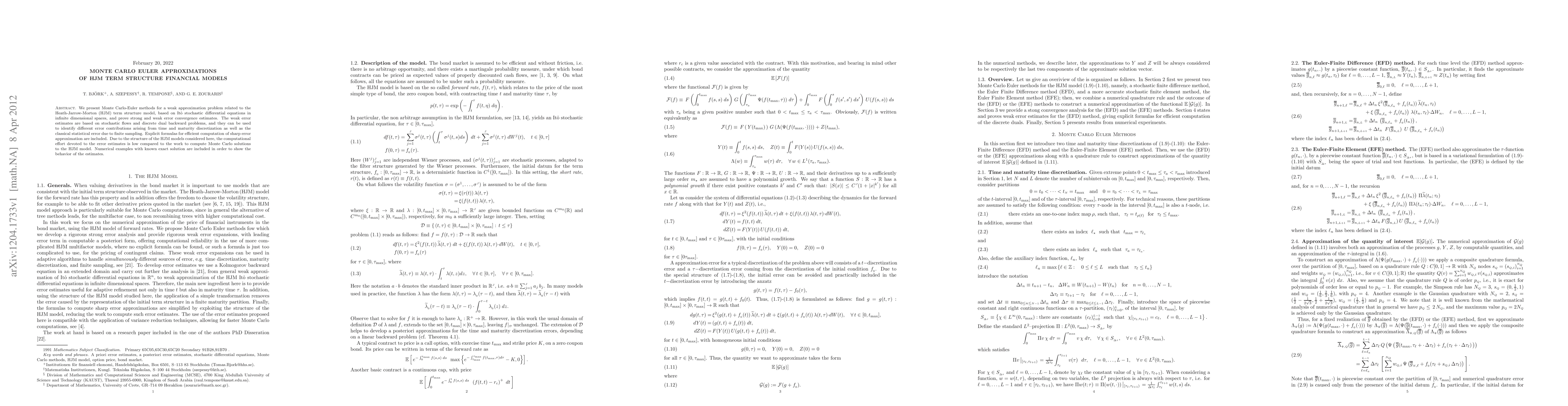 This paper proposes Monte Carlo-Euler methods for approximating the Heath-Jarrow-Morton term structure model using Ito stochastic differential equations, demonstrating strong and weak error convergence estimates. It highlights computational efficiency in error estimation compared to full Monte Carlo simulations and includes numerical examples for validation.