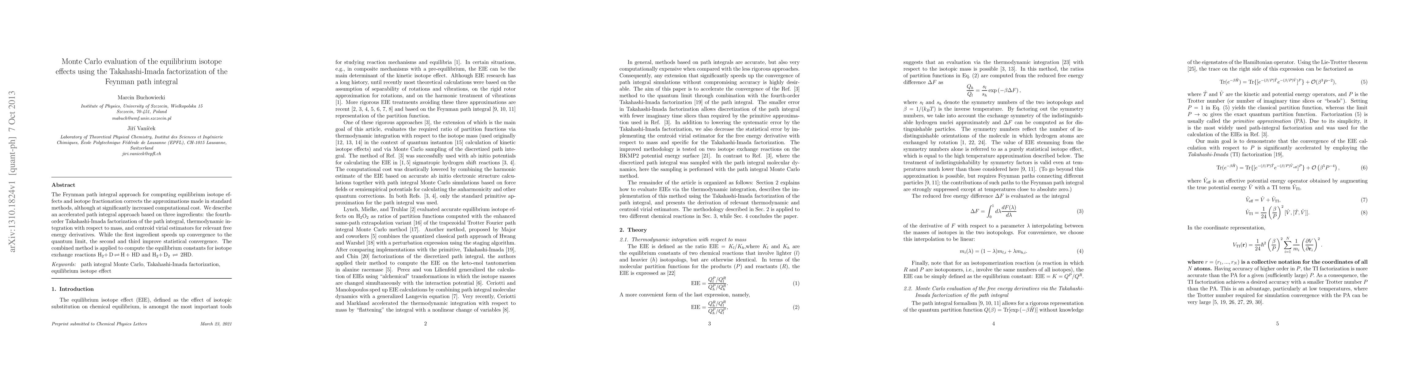 This paper presents an accelerated Monte Carlo method for calculating equilibrium isotope effects using the Takahashi-Imada factorization of the Feynman path integral, combining it with thermodynamic integration and centroid virial estimators to improve convergence. The method is demonstrated for computing equilibrium constants in isotope exchange reactions involving H2 and D.