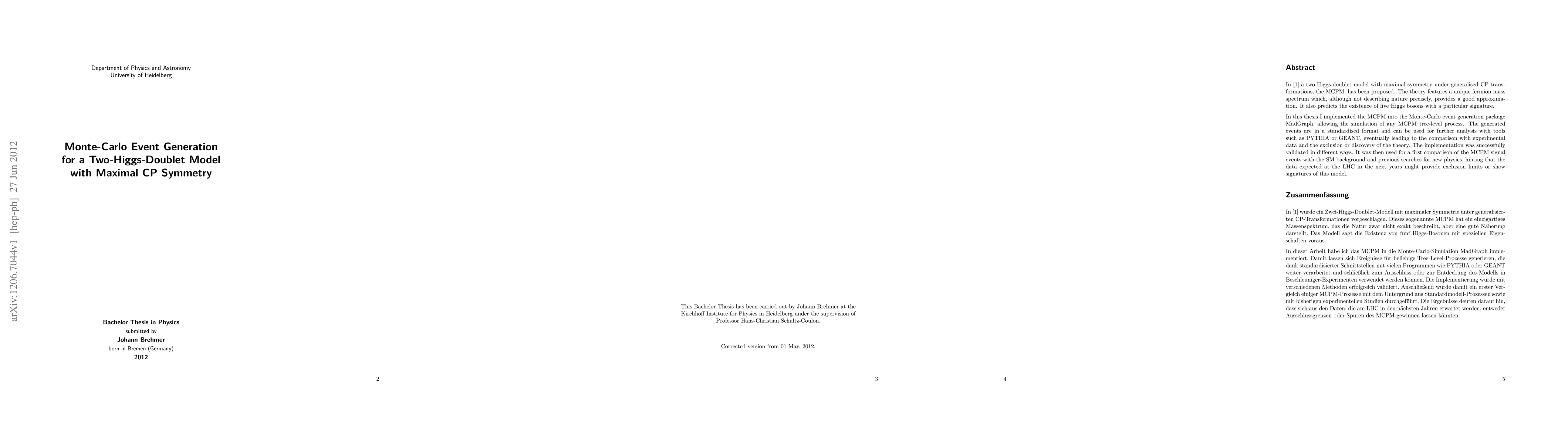 Recently a two-Higgs-doublet model with maximal symmetry under generalised CP transformations, the MCPM, has been proposed. The theory features a unique fermion mass spectrum which, although not describing nature precisely, provides a good approximation. It also predicts the existence of five Higgs bosons with a particular signature. In this thesis I implemented the MCPM into the Monte-Carlo event generation package MadGraph, allowing the simulation of any MCPM tree-level process. The generated events are in a standardised format and can be used for further analysis with tools such as PYTHIA or GEANT, eventually leading to the comparison with experimental data and the exclusion or discovery of the theory. The implementation was successfully validated in different ways. It was then used for a first comparison of the MCPM signal events with the SM background and previous searches for new physics, hinting that the data expected at the LHC in the next years might provide exclusion limits or show signatures of this model.