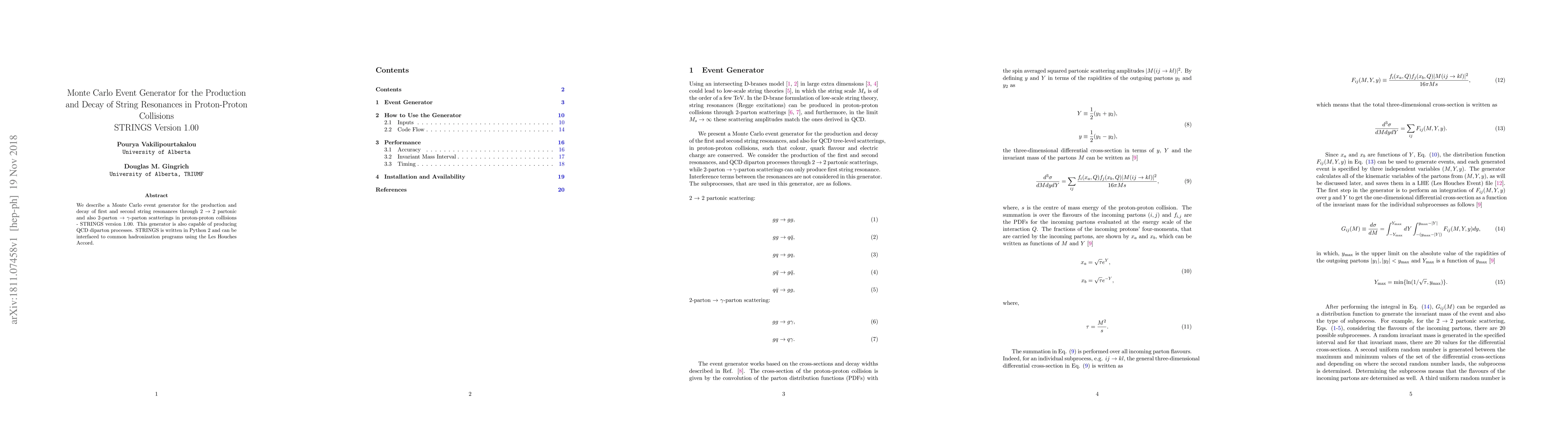 We describe a Monte Carlo event generator for the production and decay of first and second string resonances through 2 $\rightarrow$ 2 partonic and also 2-parton $\rightarrow$ $\gamma$-parton scatterings in proton-proton collisions - STRINGS version 1.00. This generator is also capable of producing QCD diparton processes. STRINGS is written in Python 2 and can be interfaced to common hadronization programs using the Les Houches Accord.
