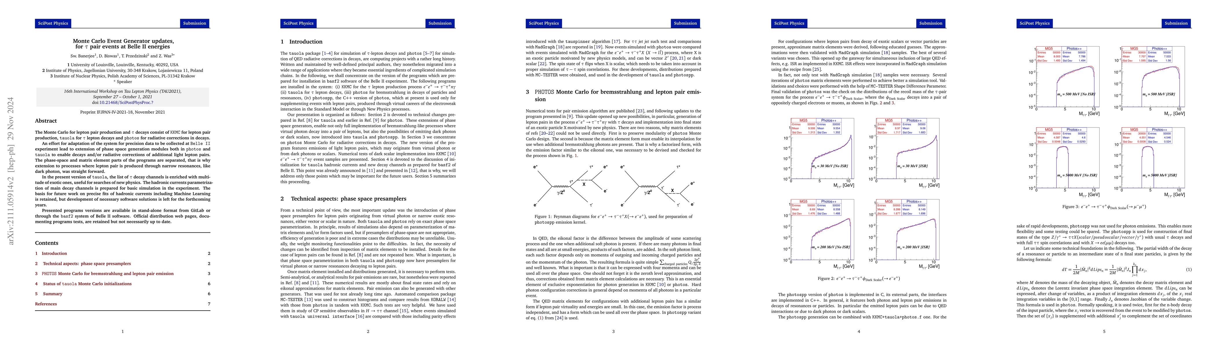 The Monte Carlo for lepton pair production and tau decays consist of KKMC for lepton pair production, tauola for tau lepton decays and photos for radiative corrections in decays. An effort for adaptation of the system for precision data to be collected at Belle II experiment lead to extension of phase space generation modules both in photos and tauola to enable decays and/or radiative corrections of additional light lepton pairs. The phase-space and matrix element parts of the programs are separated, that is why extension to processes where lepton pair is produced through narrow resonances, like dark photon, was straight forward. In the present version of tauola, list of tau decay channels is enriched with multitude of exotic ones, useful for searches of new physics. The hadronic currents parametrizations of main decay channels is prepared for basic simulation in the experiment. The basis for future work on precise fits of hadronic currents including Machine Learning is retained, but development of necessary software solutions is left for the forthcoming years. Presented programs versions are available in stand-alone format from gitlab or through the basf2 system of Belle II software. Official distribution web pages, documenting programs tests, are retained but not necessarily up to the date.