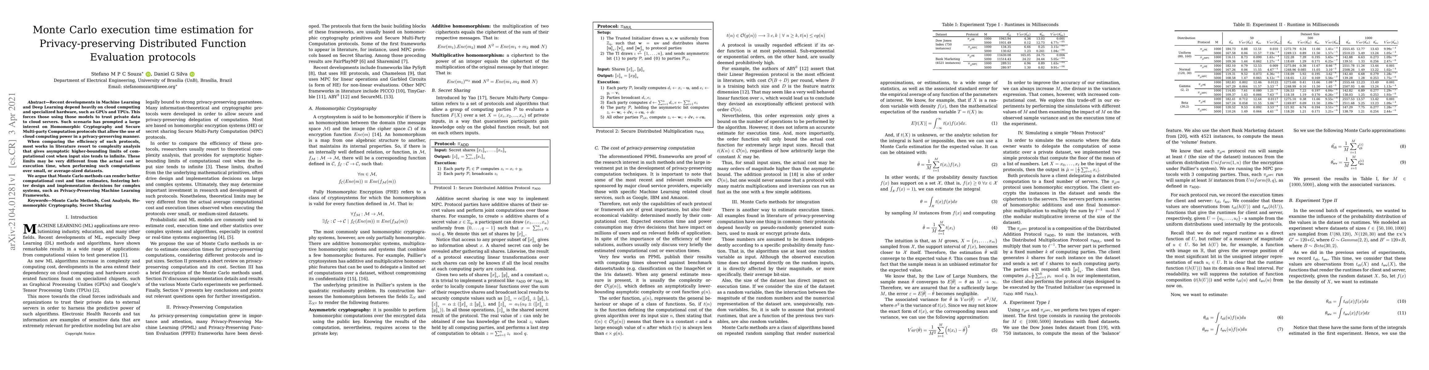 This paper explores the use of Monte Carlo methods to estimate the execution time of privacy-preserving distributed function evaluation protocols, arguing that these methods provide more accurate cost estimates compared to traditional asymptotic complexity analysis, especially for practical, finite-sized datasets.