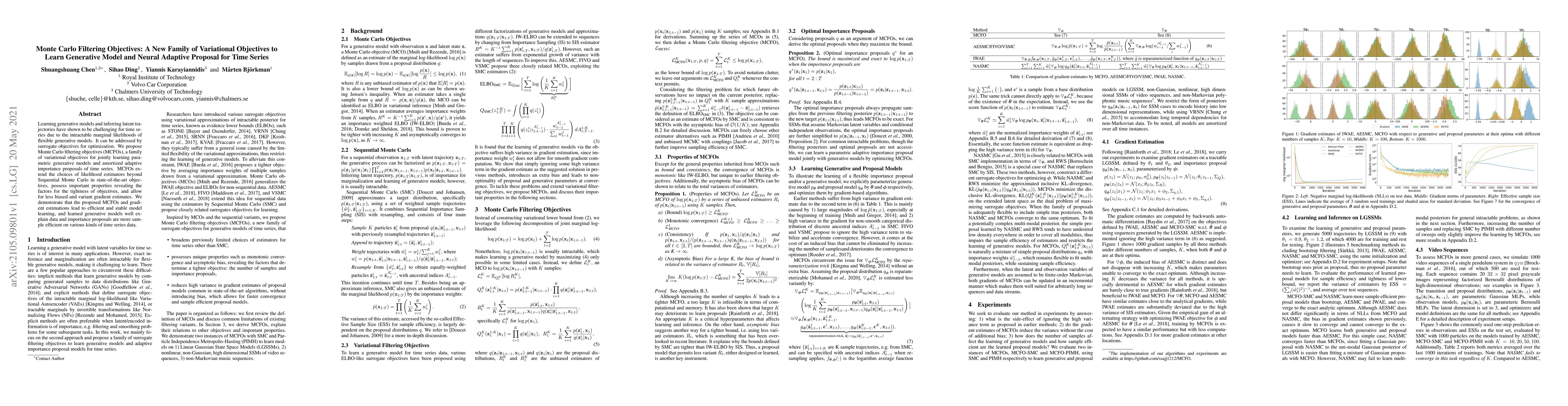 Learning generative models and inferring latent trajectories have shown to be challenging for time series due to the intractable marginal likelihoods of flexible generative models. It can be addressed by surrogate objectives for optimization. We propose Monte Carlo filtering objectives (MCFOs), a family of variational objectives for jointly learning parametric generative models and amortized adaptive importance proposals of time series. MCFOs extend the choices of likelihood estimators beyond Sequential Monte Carlo in state-of-the-art objectives, possess important properties revealing the factors for the tightness of objectives, and allow for less biased and variant gradient estimates. We demonstrate that the proposed MCFOs and gradient estimations lead to efficient and stable model learning, and learned generative models well explain data and importance proposals are more sample efficient on various kinds of time series data.