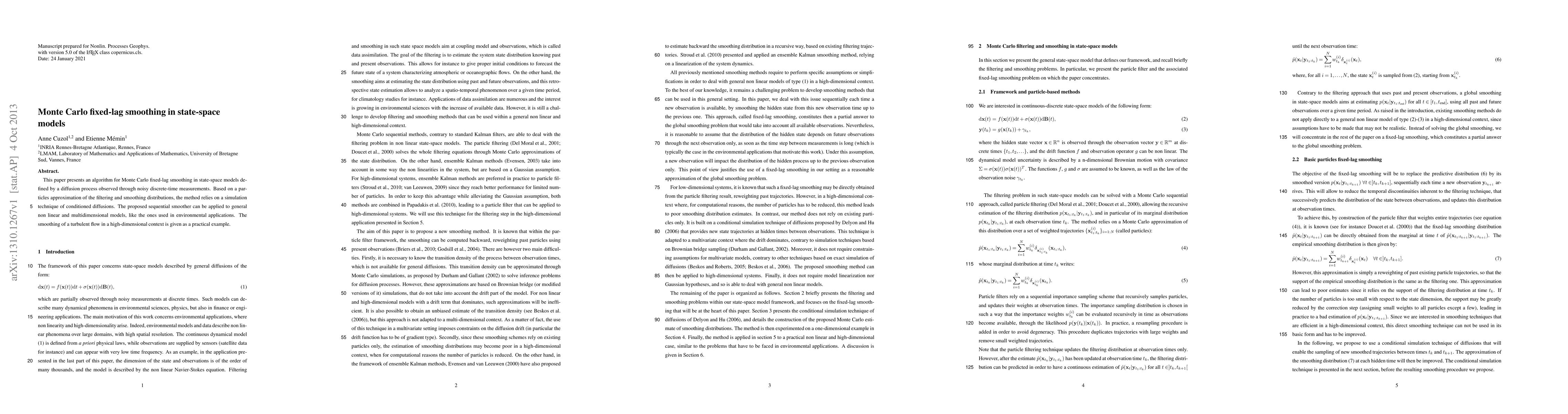 This paper introduces an algorithm for Monte Carlo fixed-lag smoothing in state-space models, utilizing particle approximations and conditioned diffusion simulations. It applies to general nonlinear and multidimensional models, exemplified by smoothing turbulent flow in environmental applications.