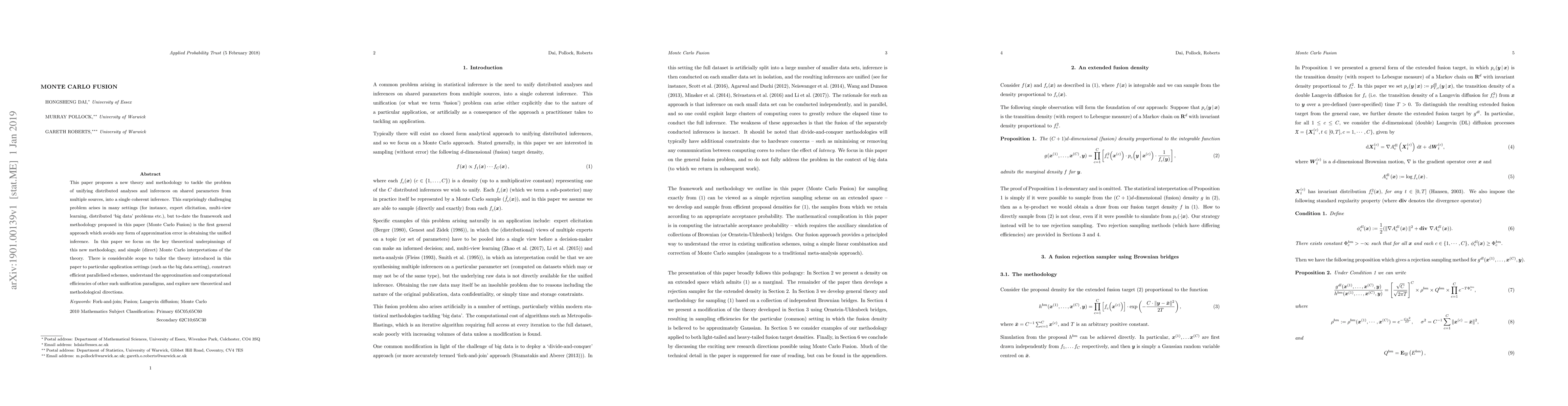 This paper proposes a new theory and methodology to tackle the problem of unifying distributed analyses and inferences on shared parameters from multiple sources, into a single coherent inference. This surprisingly challenging problem arises in many settings (for instance, expert elicitation, multi-view learning, distributed 'big data' problems etc.), but to-date the framework and methodology proposed in this paper (Monte Carlo Fusion) is the first general approach which avoids any form of approximation error in obtaining the unified inference. In this paper we focus on the key theoretical underpinnings of this new methodology, and simple (direct) Monte Carlo interpretations of the theory. There is considerable scope to tailor the theory introduced in this paper to particular application settings (such as the big data setting), construct efficient parallelised schemes, understand the approximation and computational efficiencies of other such unification paradigms, and explore new theoretical and methodological directions.