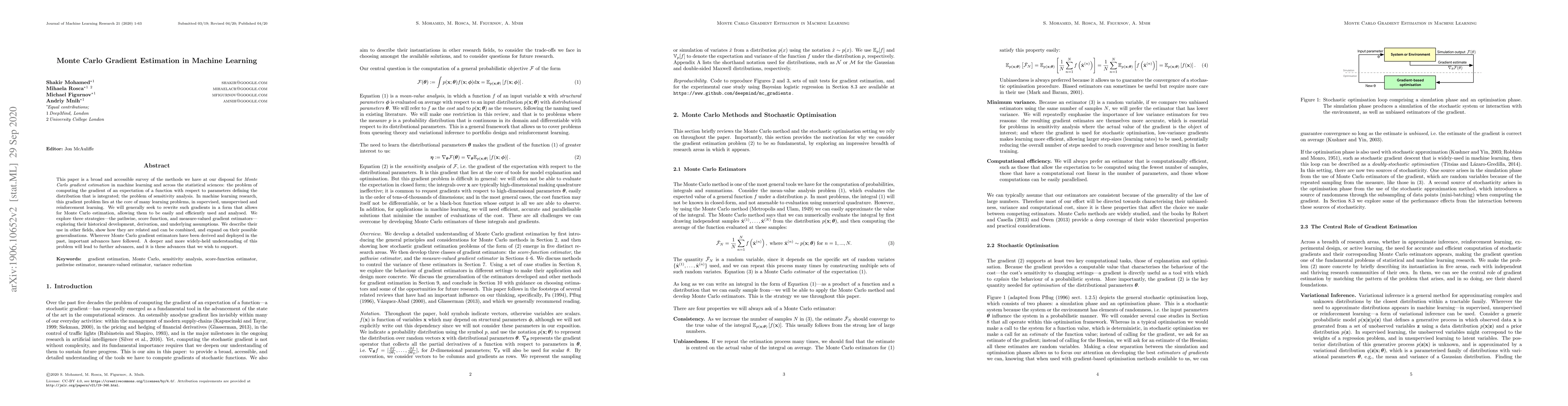 This paper surveys methods for Monte Carlo gradient estimation in machine learning, focusing on the core problem of computing gradients of expectations. It explores three strategies—pathwise, score function, and measure-valued gradient estimators—and discusses their historical development, applications, and potential for future advancements.