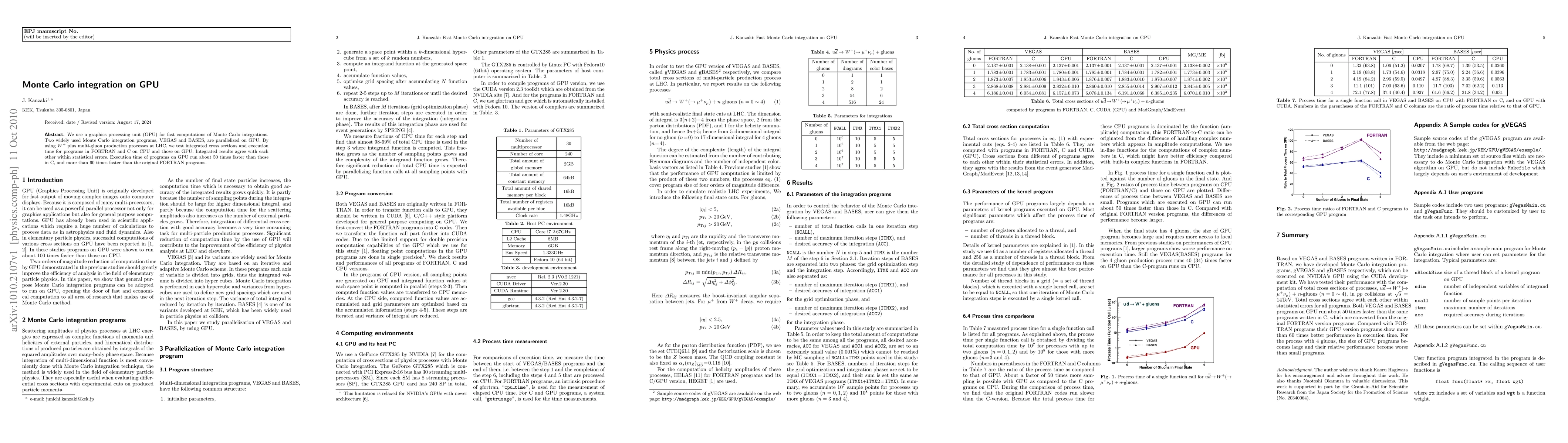 This paper demonstrates the use of GPUs to significantly speed up Monte Carlo integration computations, parallelizing programs VEGAS and BASES. Results show GPU-based implementations run 50 times faster than C programs and over 60 times faster than FORTRAN programs, with integrated cross sections matching within statistical errors.