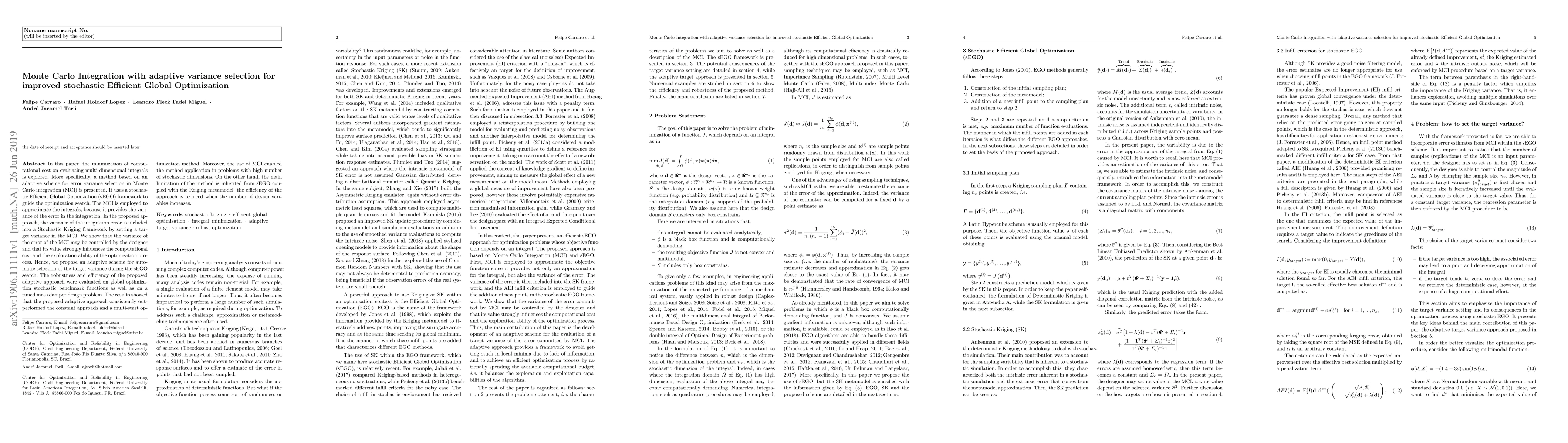 This paper proposes an adaptive variance selection scheme in Monte Carlo Integration (MCI) within a Stochastic Efficient Global Optimization (sEGO) framework to minimize computational cost for evaluating multi-dimensional integrals. The adaptive scheme improves optimization efficiency and outperforms constant variance and multi-start methods, though it faces efficiency challenges with a high number of design variables.