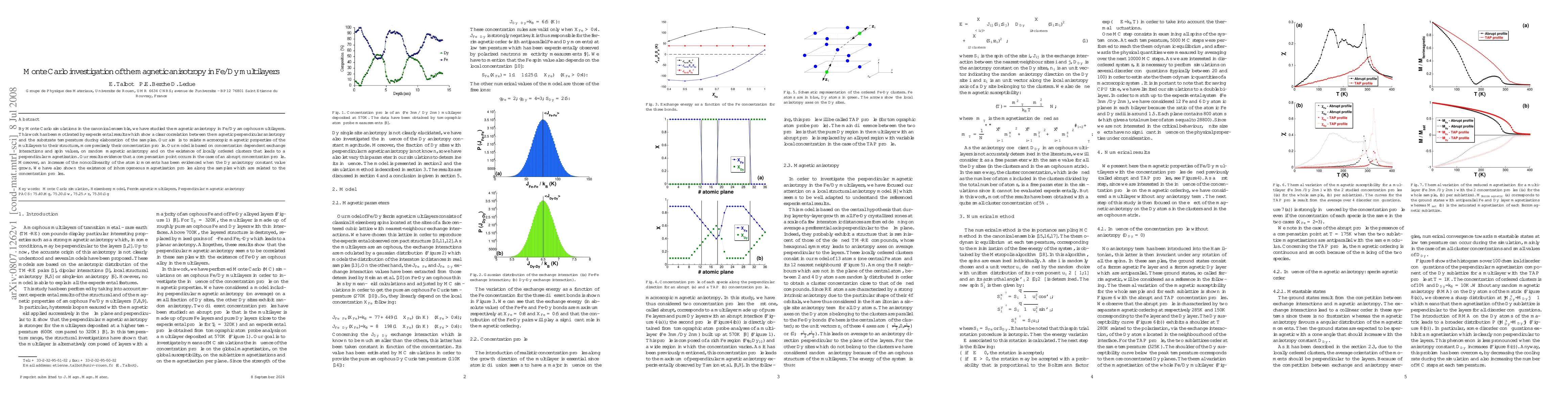 This study uses Monte Carlo simulations to investigate the magnetic anisotropy in Fe/Dy multilayers, revealing a compensation point in abrupt concentration profiles and an increase in noncollinearity with higher Dy anisotropy. The research correlates macroscopic magnetic properties with structural concentration profiles, highlighting inhomogeneous magnetization linked to these profiles.
