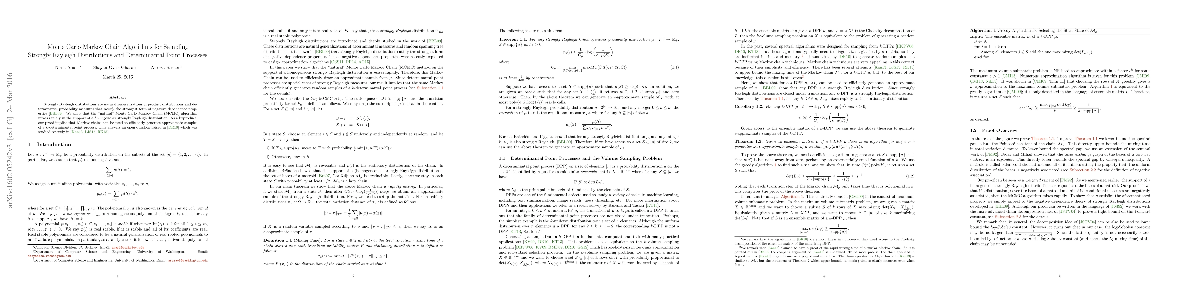This paper demonstrates that Monte Carlo Markov Chain (MCMC) algorithms efficiently sample from strongly Rayleigh distributions and can generate approximate samples for $k$-determinantal point processes, resolving an open question regarding the latter. The MCMC method is shown to rapidly mix within the support of homogeneous strongly Rayleigh distributions.