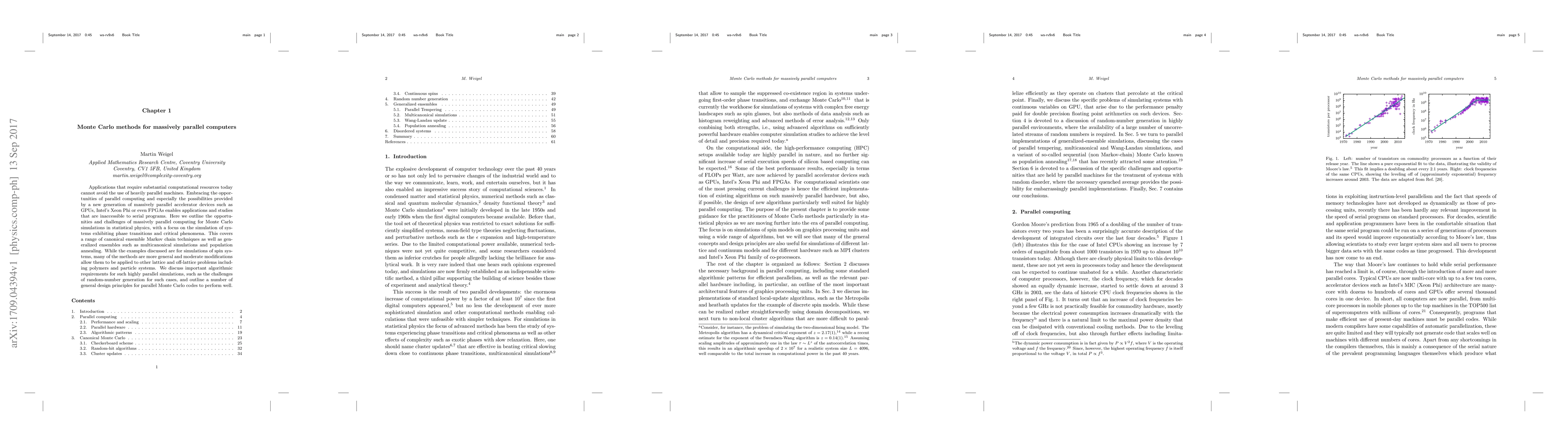 This paper explores the application of Monte Carlo methods on massively parallel computing systems, focusing on the advantages and challenges for simulating statistical physics systems, particularly those exhibiting phase transitions. It discusses parallelization strategies, algorithmic requirements, and design principles for effective parallel Monte Carlo simulations, with examples primarily from spin systems but applicable to other lattice and off-lattice problems.