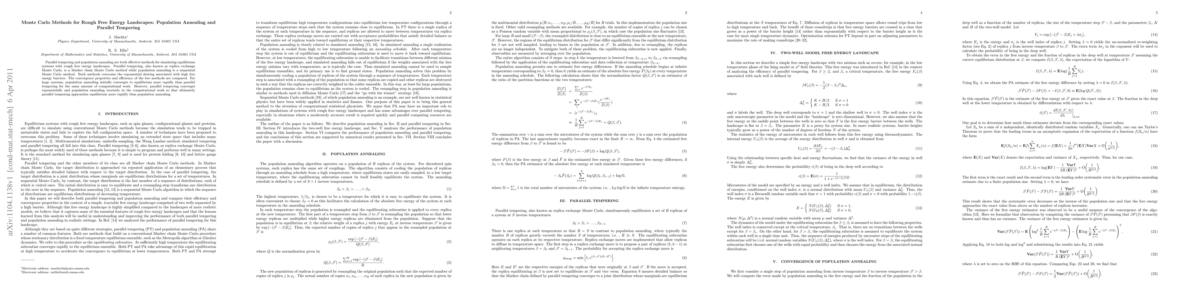 This paper compares parallel tempering and population annealing methods for simulating equilibrium systems with complex free energy landscapes. While population annealing converges faster initially, parallel tempering ultimately reaches equilibrium more rapidly due to its exponential convergence rate.