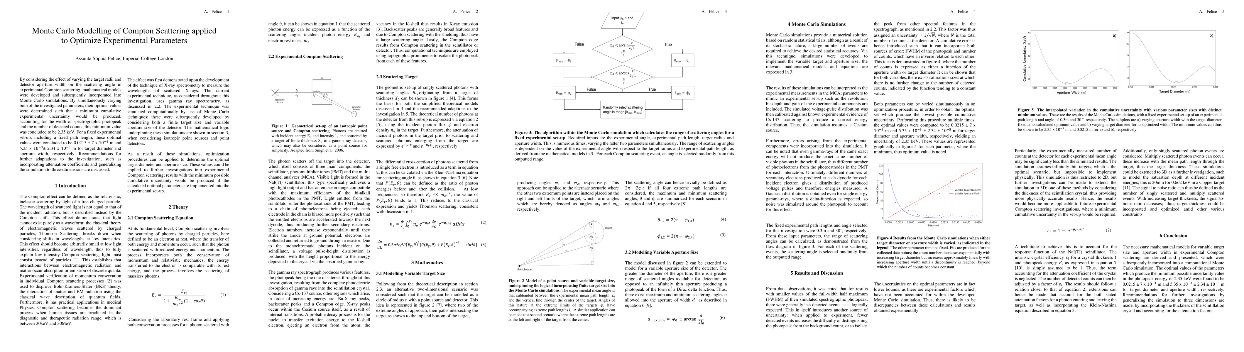 This paper uses Monte Carlo simulations to optimize experimental parameters for Compton scattering by determining the optimal target radii and detector aperture width to minimize cumulative experimental uncertainty, achieving a minimum of 2.35 keV. Future work could incorporate attenuation coefficients and extend the simulation to three dimensions.