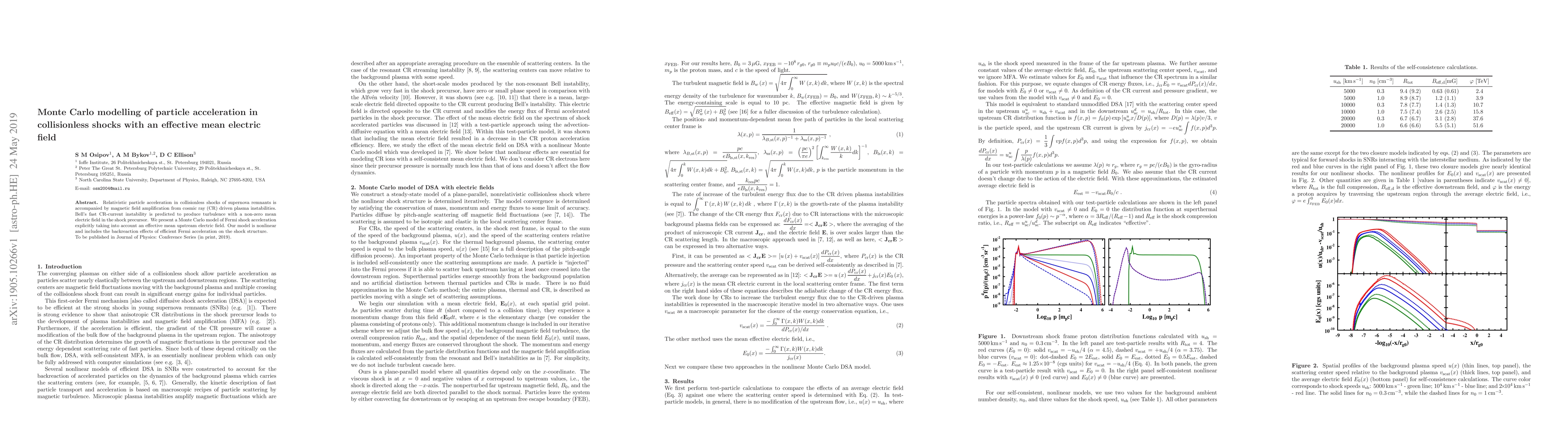 This paper presents a Monte Carlo model for particle acceleration in collisionless shocks, incorporating an effective mean electric field generated by cosmic ray-driven plasma instabilities. The model accounts for nonlinear effects and backreaction on the shock structure, providing insights into relativistic particle acceleration in supernova remnants.
