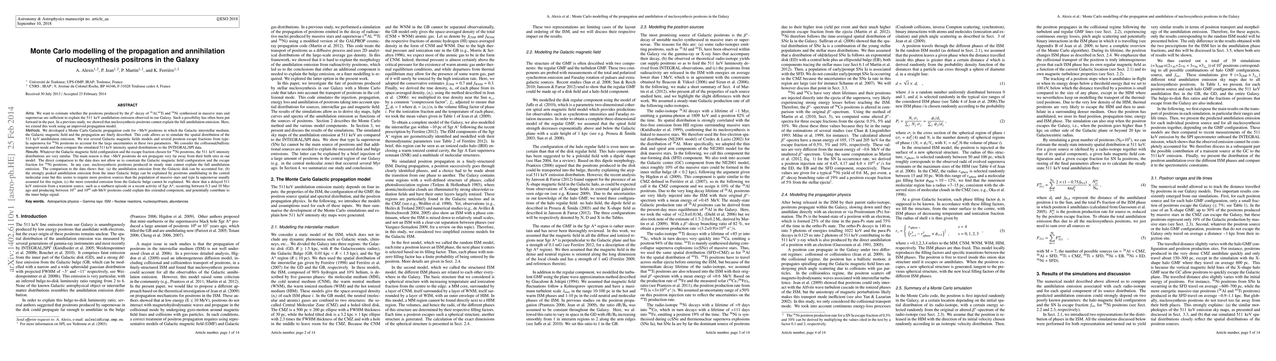 This paper uses Monte Carlo modelling to simulate the propagation and annihilation of positrons from nucleosynthesis in the Galaxy, finding that steady-state positron sources from massive stars and supernovae cannot fully account for the observed 511 keV annihilation emission. A transient source, like a starburst episode, may explain the extended emission from the Galactic bulge.