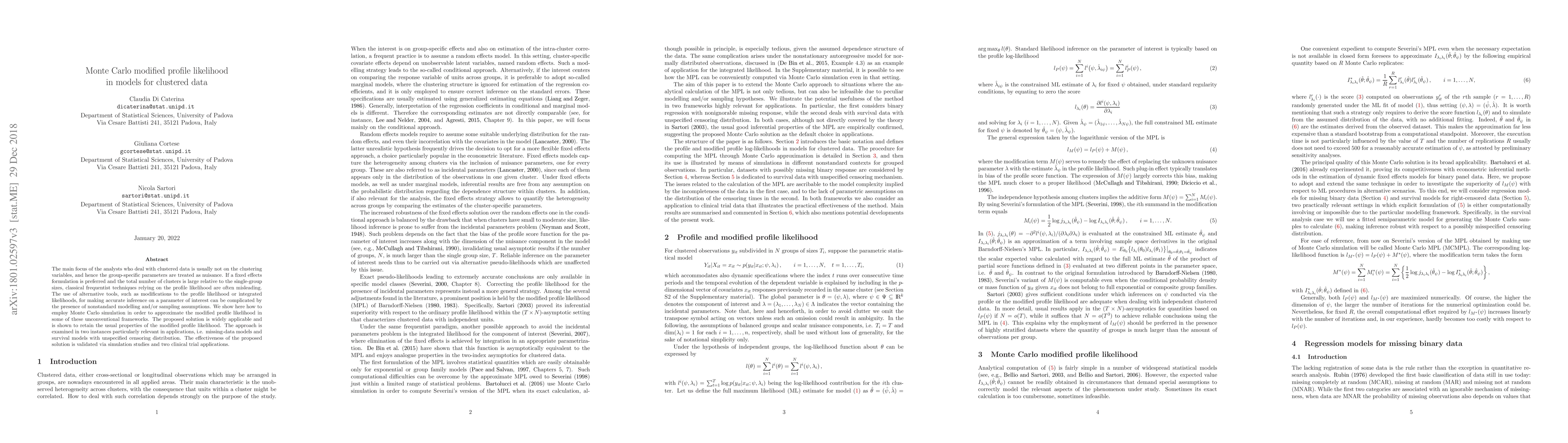 This paper proposes a Monte Carlo simulation method to approximate the modified profile likelihood for clustered data, addressing the challenges of large numbers of clusters relative to group sizes. The method is validated through simulation studies and applications in missing-data and survival models with unspecified censoring.