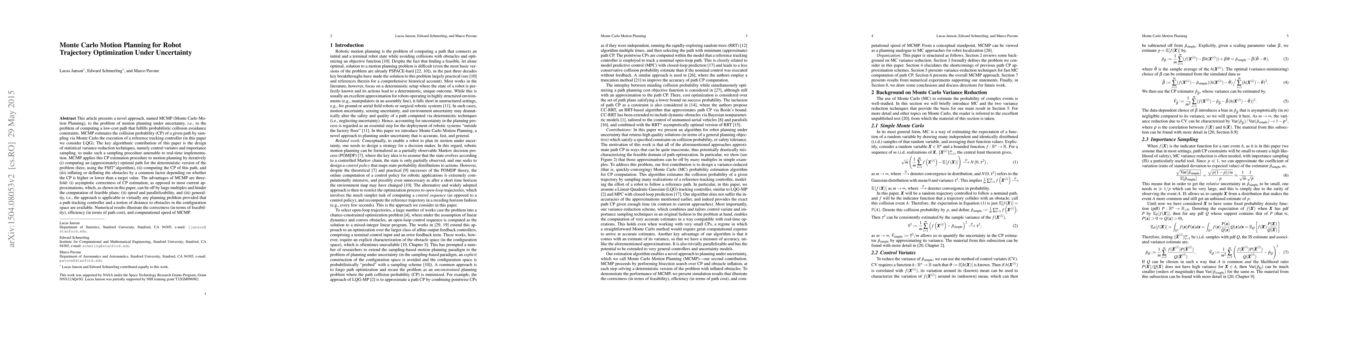 This paper introduces MCMP, a novel Monte Carlo Motion Planning method for optimizing robot trajectories under uncertainty, employing variance-reduction techniques for real-time probabilistic collision avoidance. The approach iteratively refines paths and obstacle distances, demonstrating asymptotic correctness, speed, and general applicability.