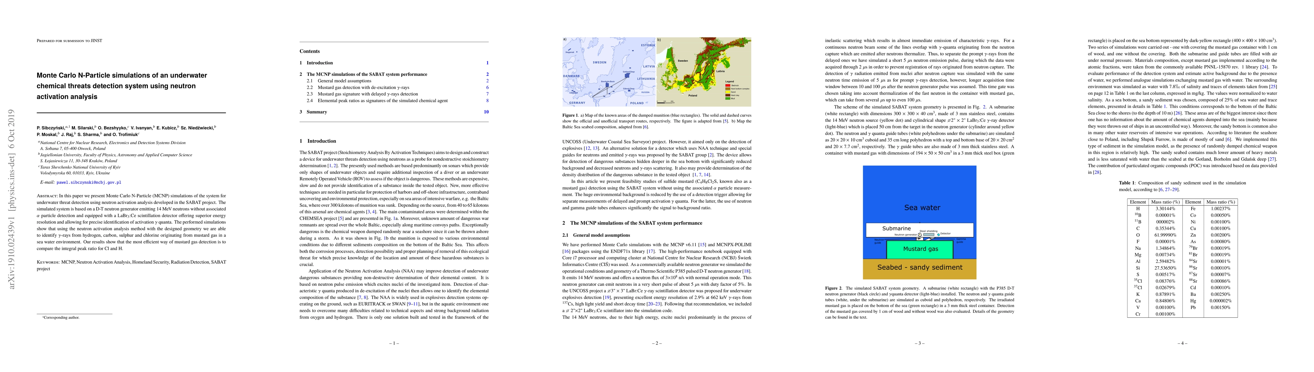 This paper presents Monte Carlo N-Particle simulations for an underwater chemical threat detection system using neutron activation analysis. The simulations demonstrate the capability to identify gamma rays from hydrogen, carbon, sulfur, and chlorine, indicating effective mustard gas detection via the Cl/H peak ratio.