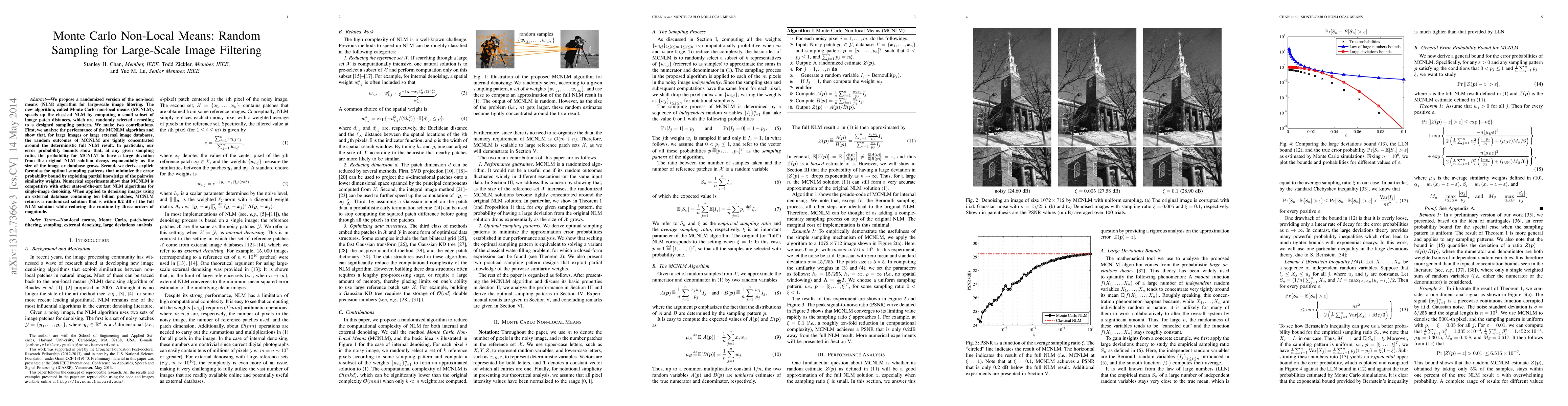 The paper proposes a Monte Carlo non-local means (MCNLM) algorithm for large-scale image filtering, which speeds up the classical non-local means (NLM) by using random sampling. The authors demonstrate that MCNLM provides results close to the full NLM solution with exponentially decreasing error probability as image size increases.